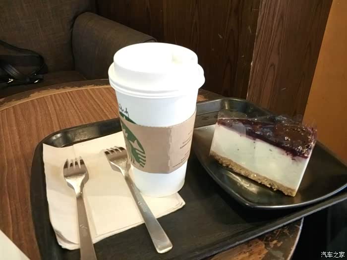 我们又继续往回走,等着商场开门,看到路边有家星巴克,于是进去坐一会,点了一块蓝莓起士蛋糕,可可卡布奇诺,还有一包薯片,坐下慢慢消磨时间
