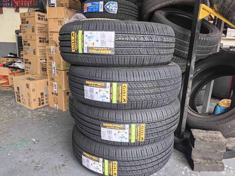 早上九点多进店。师傅已经认识我了。直接带我去看新轮胎。四条轮胎码得整整齐齐。