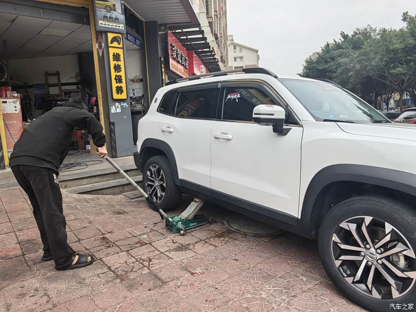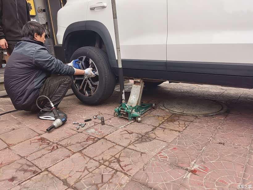 首先是卸下车轮。先右后轮。师傅熟练地用千斤顶把车子举升,再用气动扳手快速松开螺丝。麻溜地取下了轮胎。