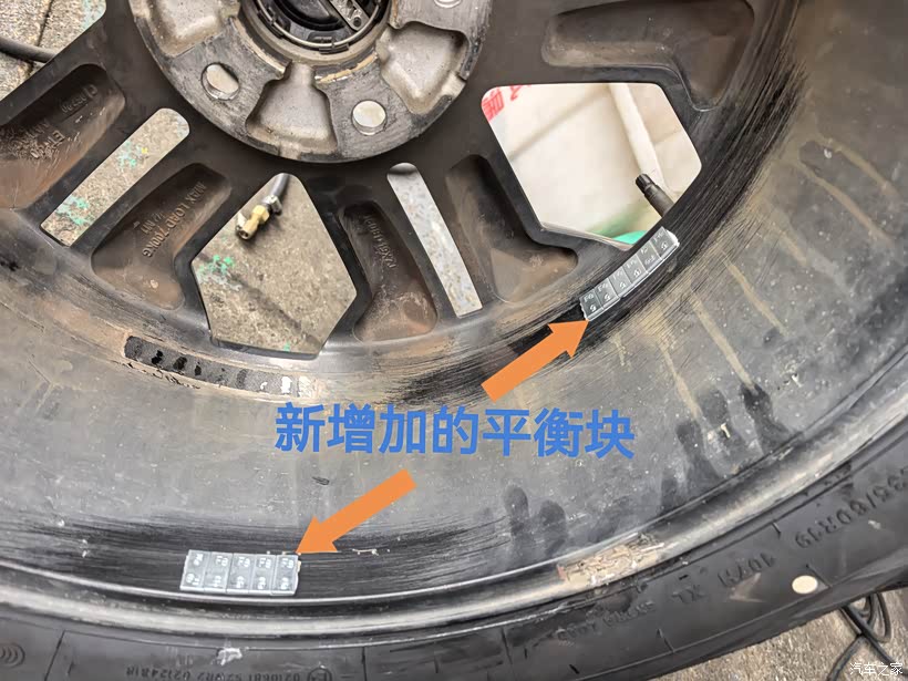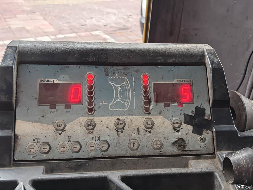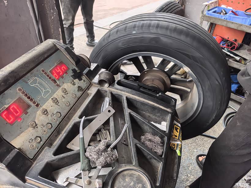 下一步要做动平衡。师傅把充满气的轮胎放到动平衡机上,先除掉原有的平衡块。转动机器,数据会显示数字。左右数值大于5就要加平衡块。轮胎每转动一次,师傅根据数值放一次平衡块。直到两边数值差不超过5为止。