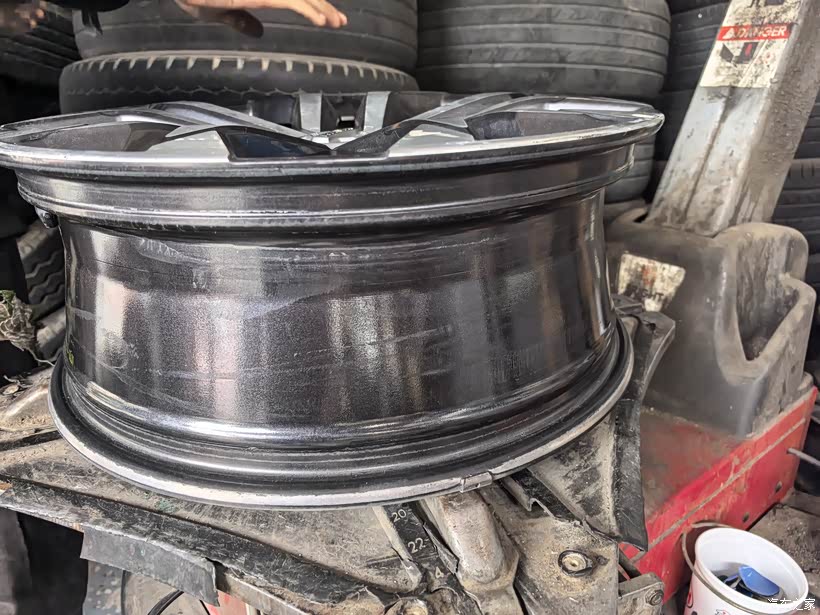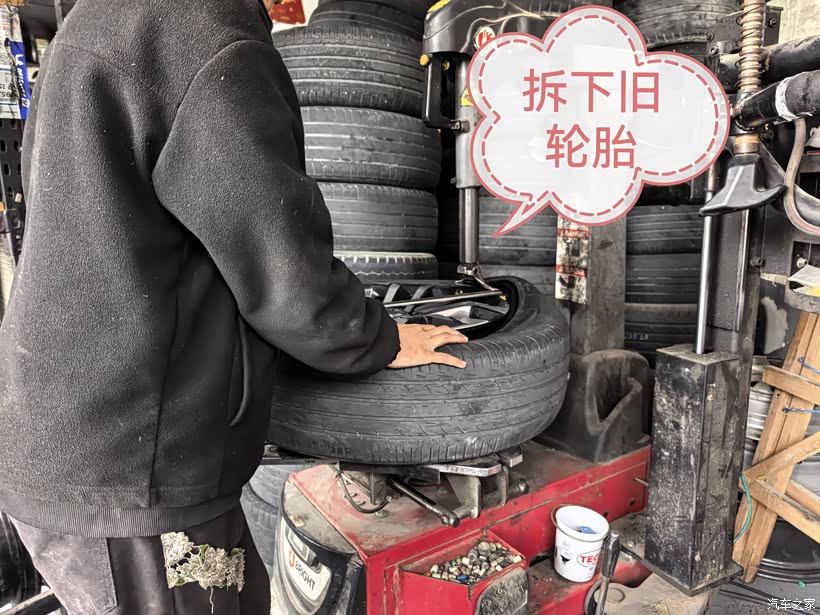 然后就是从轮辋上拆下旧轮胎。只见师傅把轮子放在一个扒胎机上,把拔胎杆插入轮胎,转动拔胎机,轮胎逐渐跟轮辋分离。