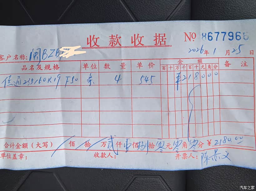 这次换四条轮胎一共花了2180元。平均每条轮胎545元。厂家有三年质保,一年内鼓包免费换新胎。