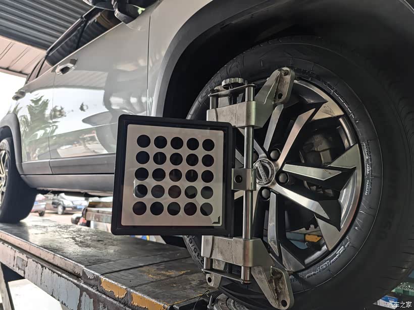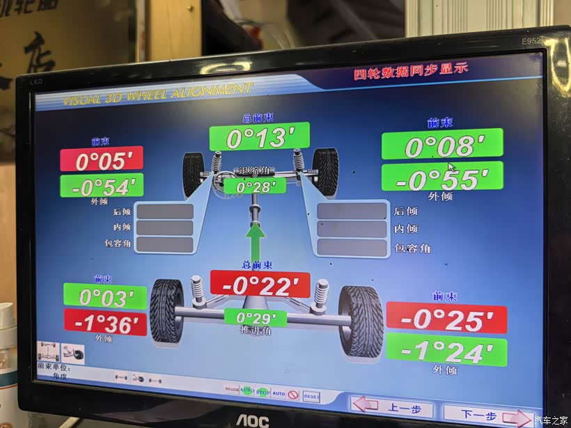 接下来,师傅在电脑上搜索哈弗大狗,带出轮胎定位参数,然后开始定位。师傅经过一番我看不懂的专业操作,最后看到定位数据。师傅说非常好,不用校正。