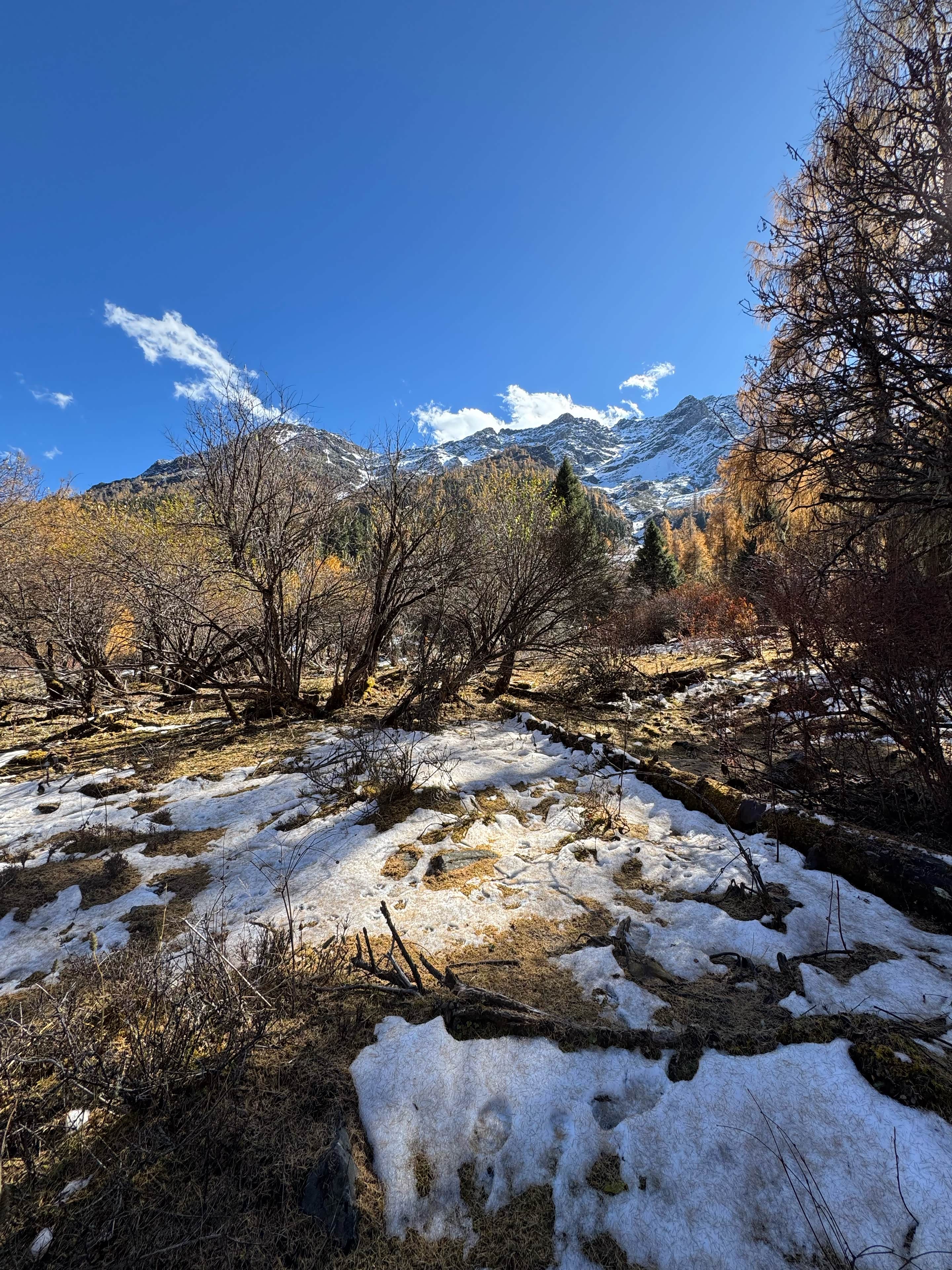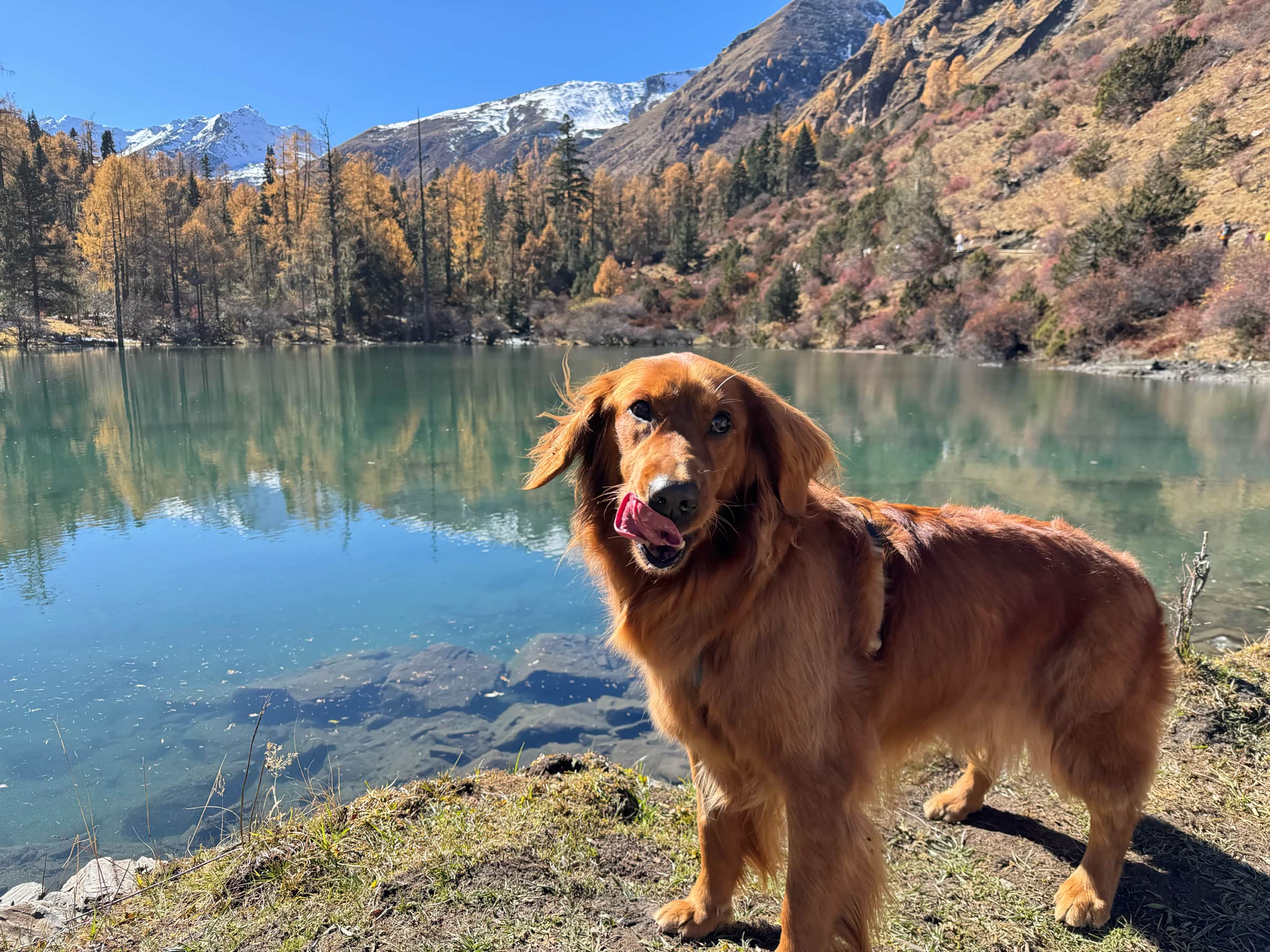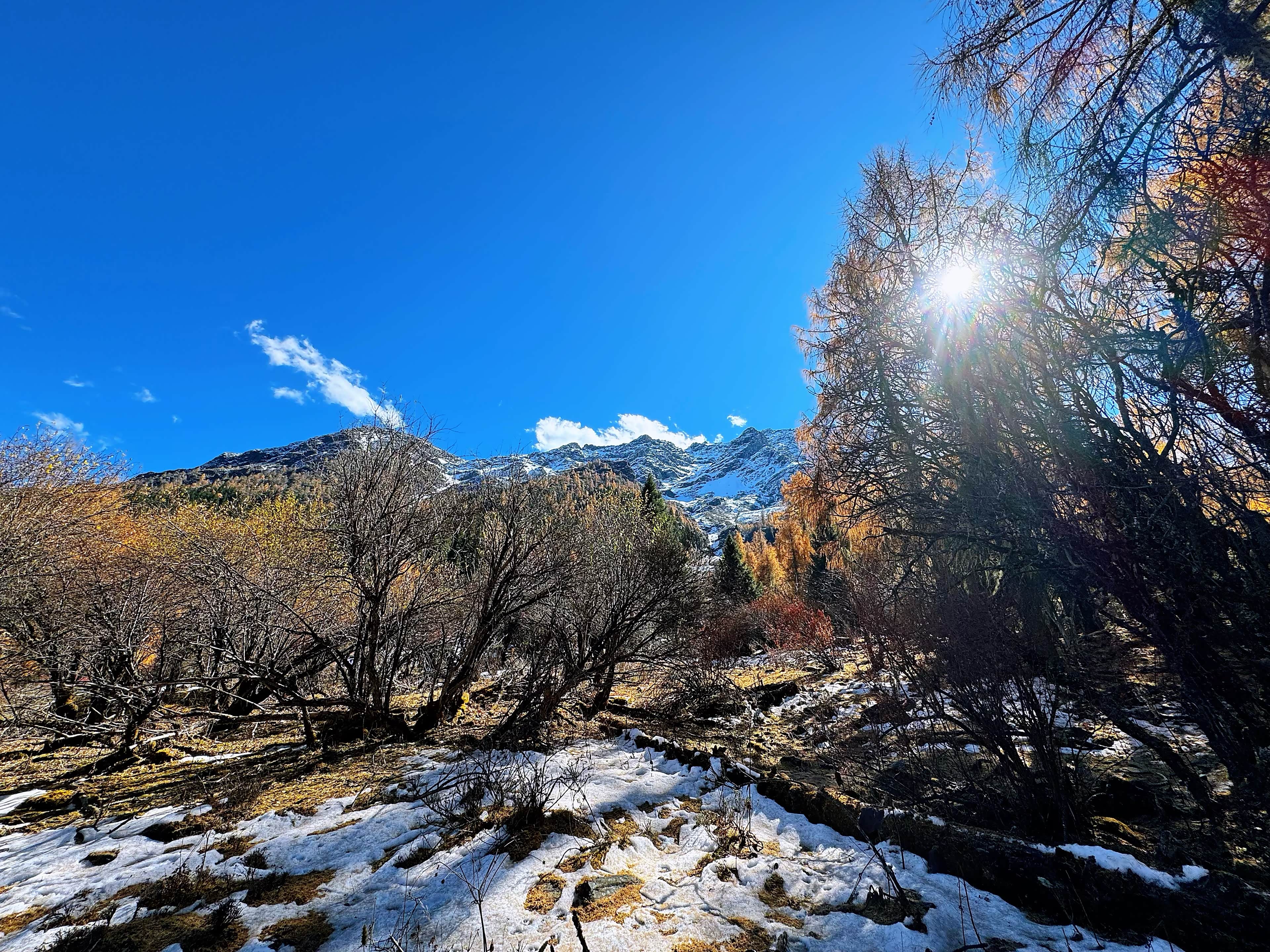走进沟里,阳光正好,这就是川西秋天应有的色彩,每一个转角,每一眼,都似一幅油画,茂密的树林,光影变幻的角度,呈现不同的颜色,深深浅浅的积雪,是孩子们的最爱,也是宠物的乐园。