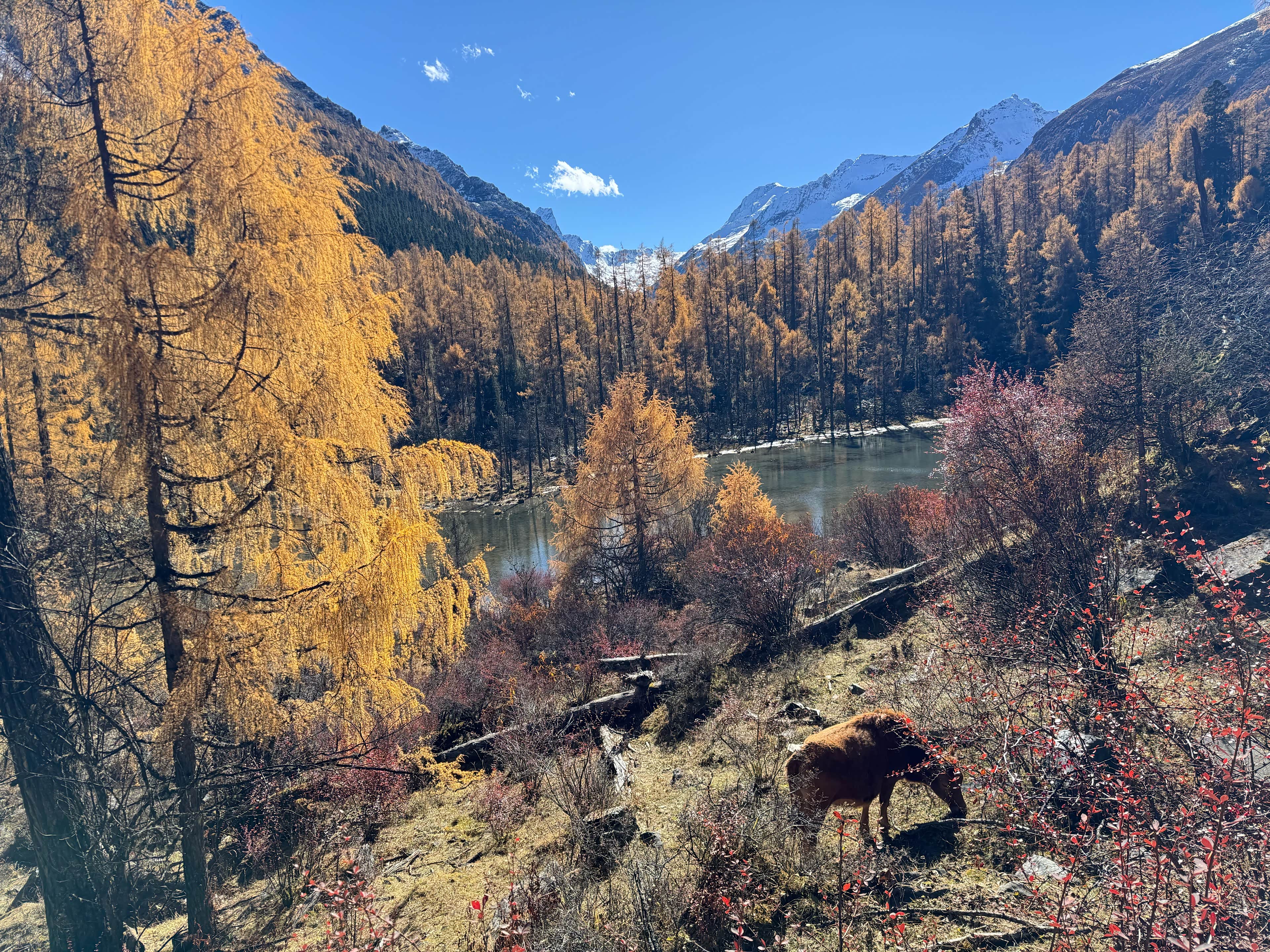 随着道路蜿蜒曲折回旋降低,整个夹金山从4100米海拔直落到2700米,沿途生态没有红原那样丰沛的高山草甸,更多的呈现出跟本地匹配的山林,牦牛的数量也少很多。
