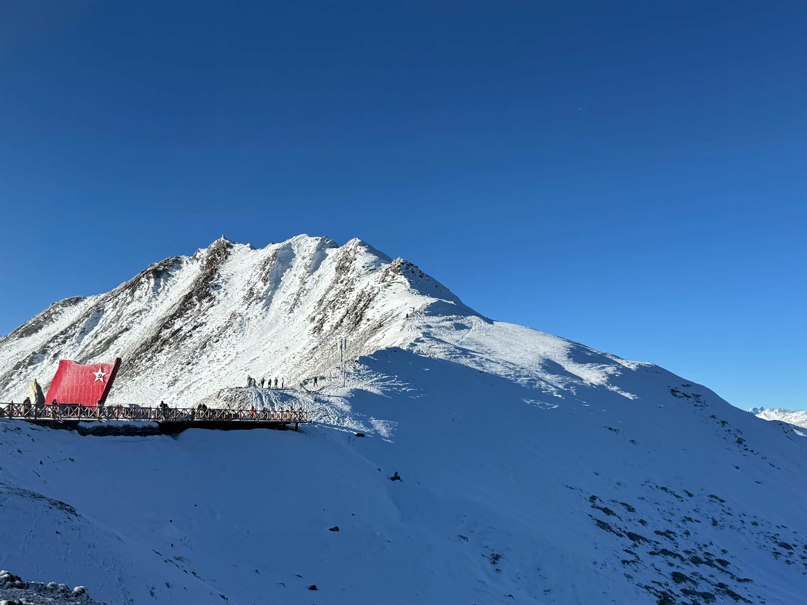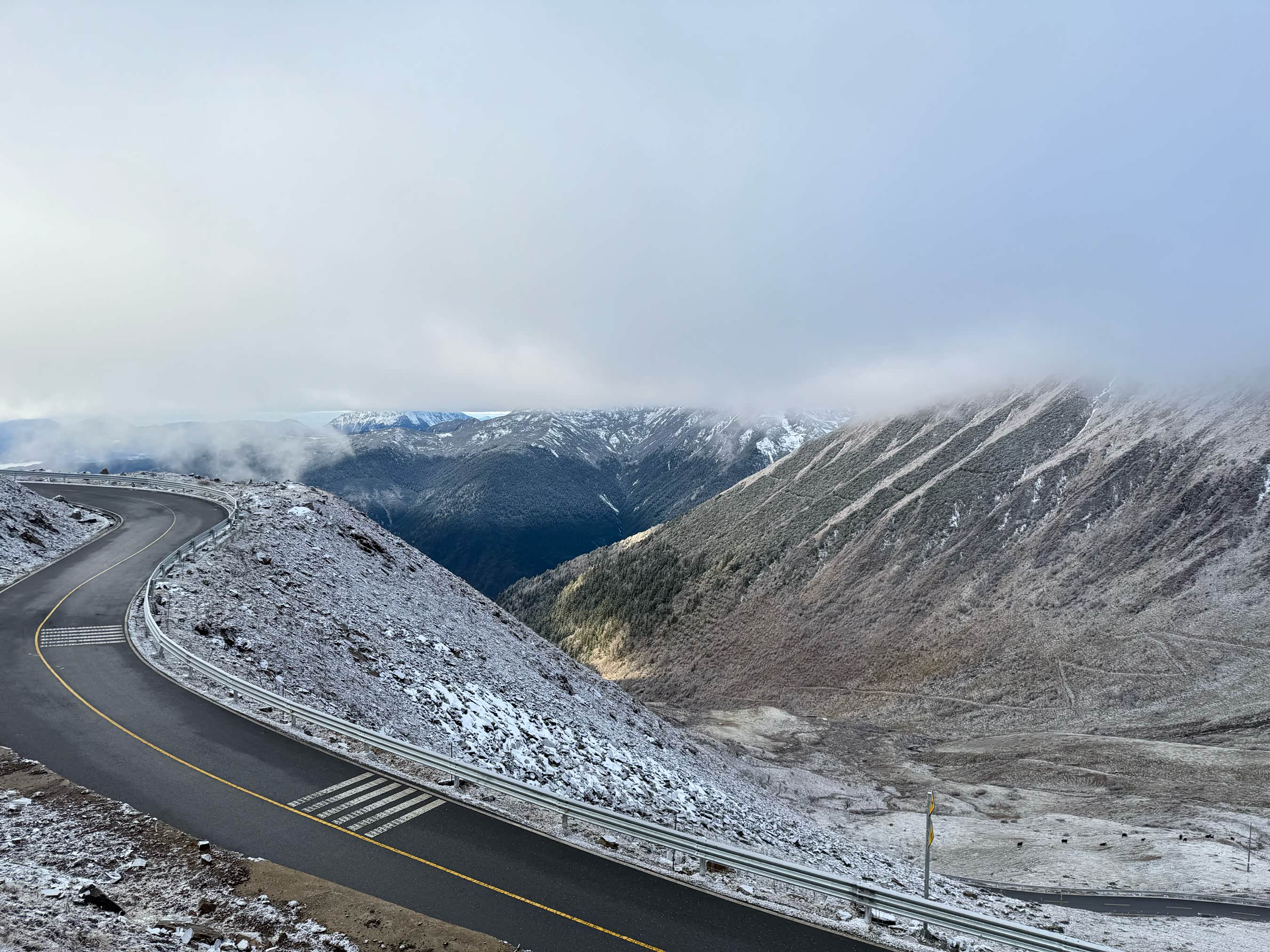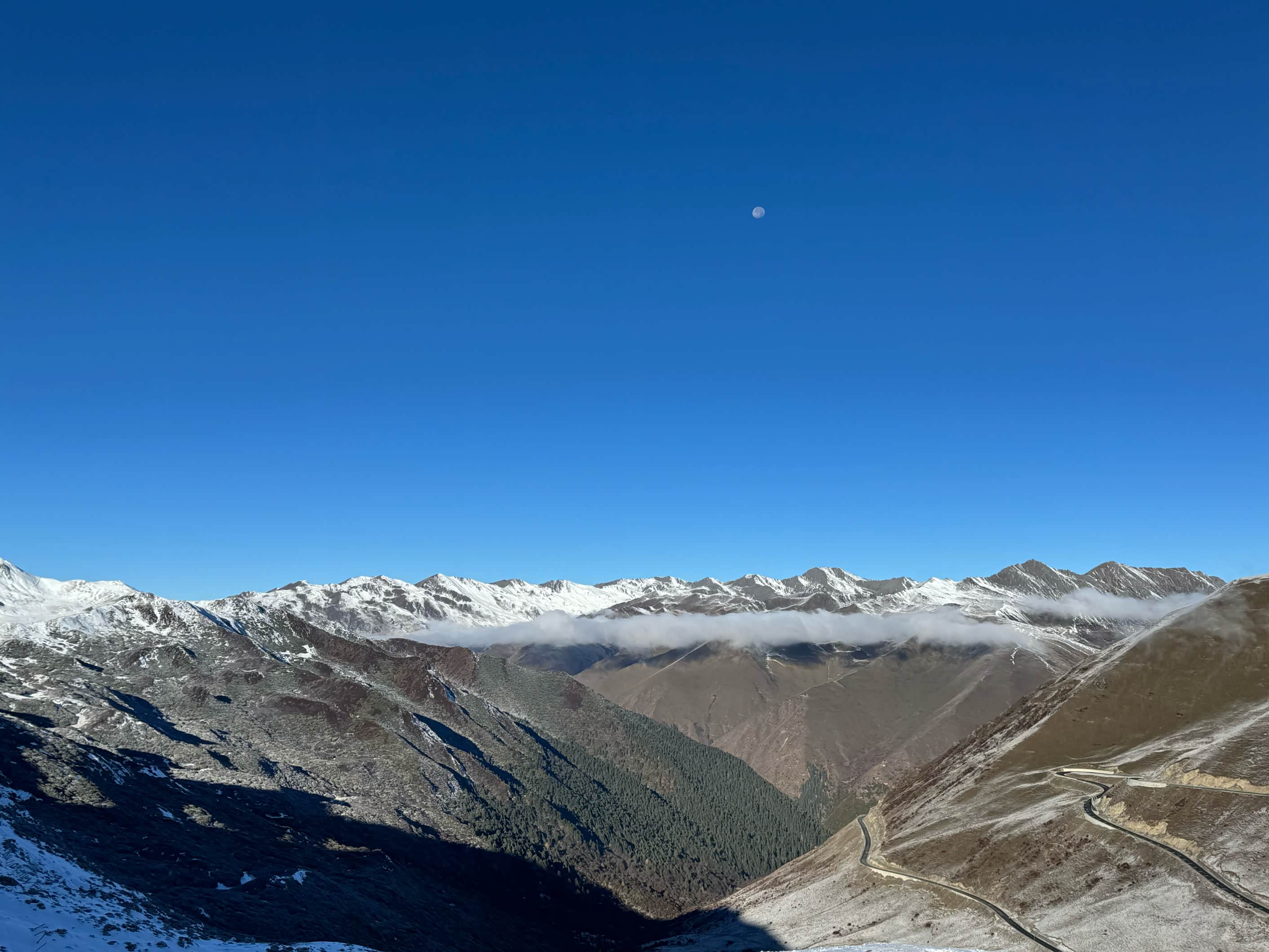在4000米垭口,雪舞中的山尖透漏出冷峻的色彩,晨曦直面,倒影就这么清晰地呈现在雪山之下,等到阳光洒满山巅,日月同辉,天湛蓝湛蓝啊,纯净之气无法言喻,围绕在雪山上的云雾似洁白的哈达,欢迎四方宾客的到来。