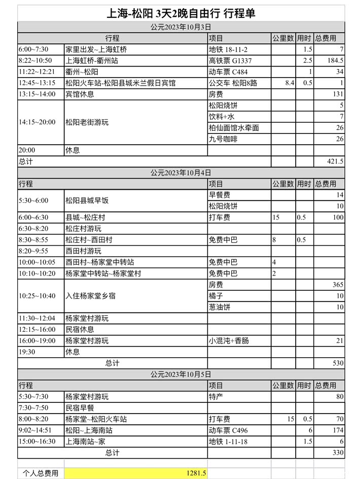 回到松阳站,因为留了半小时Buffer就变都很从容,高铁动车也很少晚点,准时坐上了返程的动车,在车窗外远观松阳远景,竟然发现还有点大理苍山的感觉,的确是一个宝藏之地,建议大家可以抽个两三天时间来放松放松,游记最后依据惯例我附上了Excel的行程和费用表,如果嫌做攻略麻烦,跟团又太不自由,那么你完全可以复刻一遍我的行程,绝对不会踩坑。