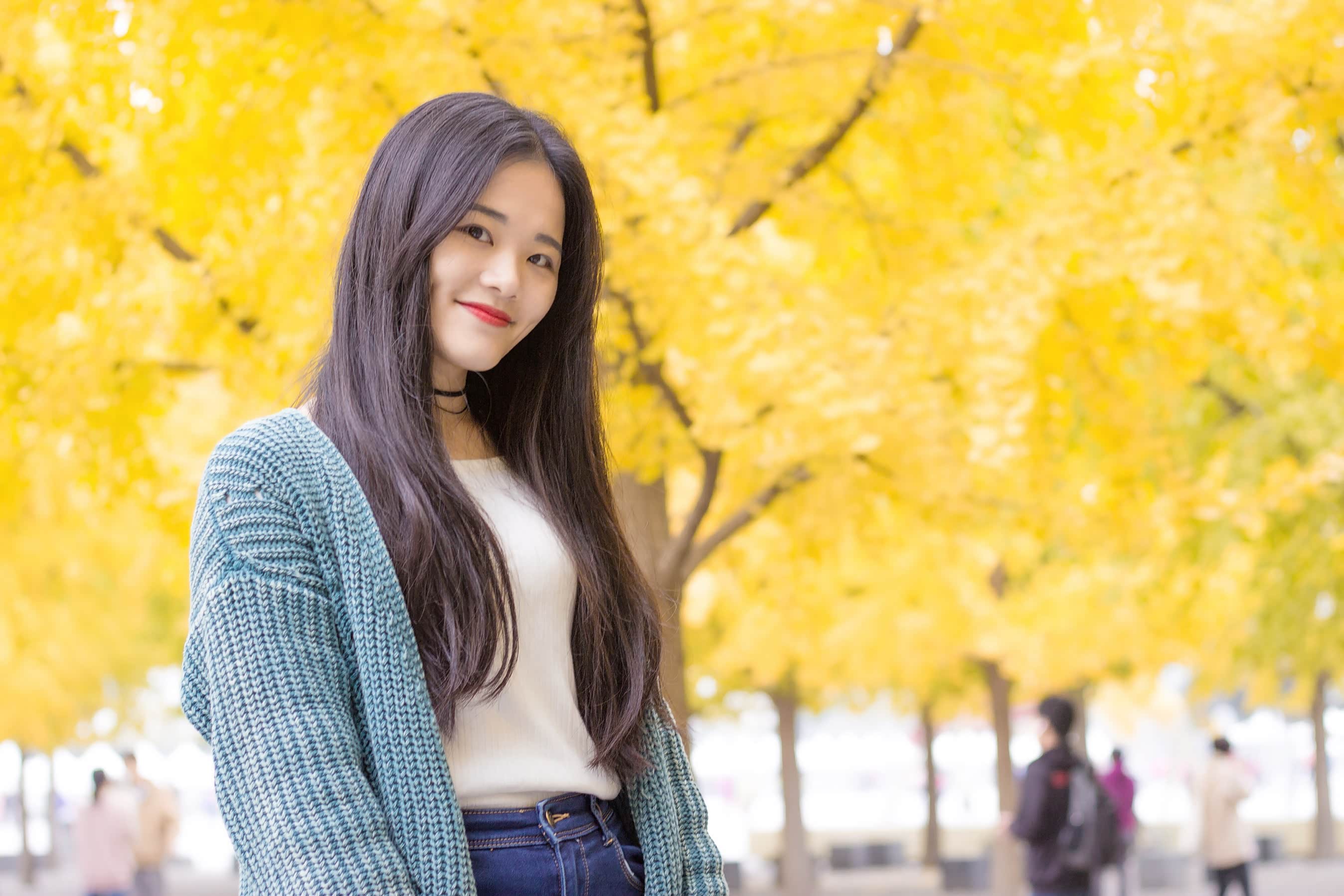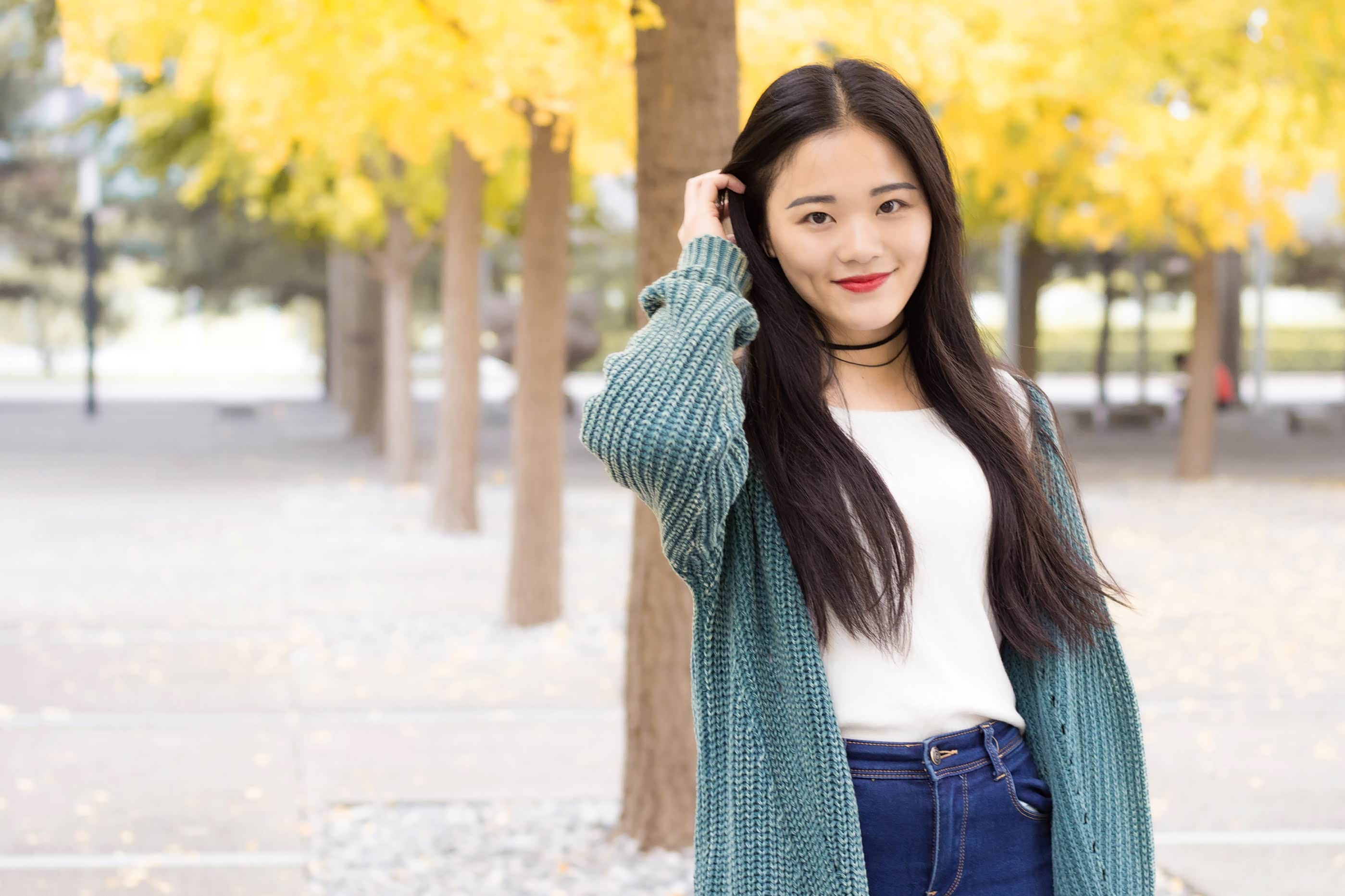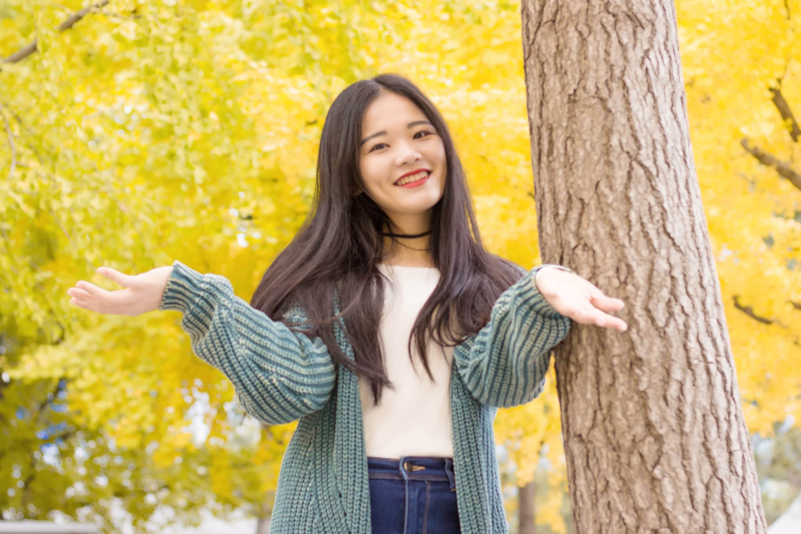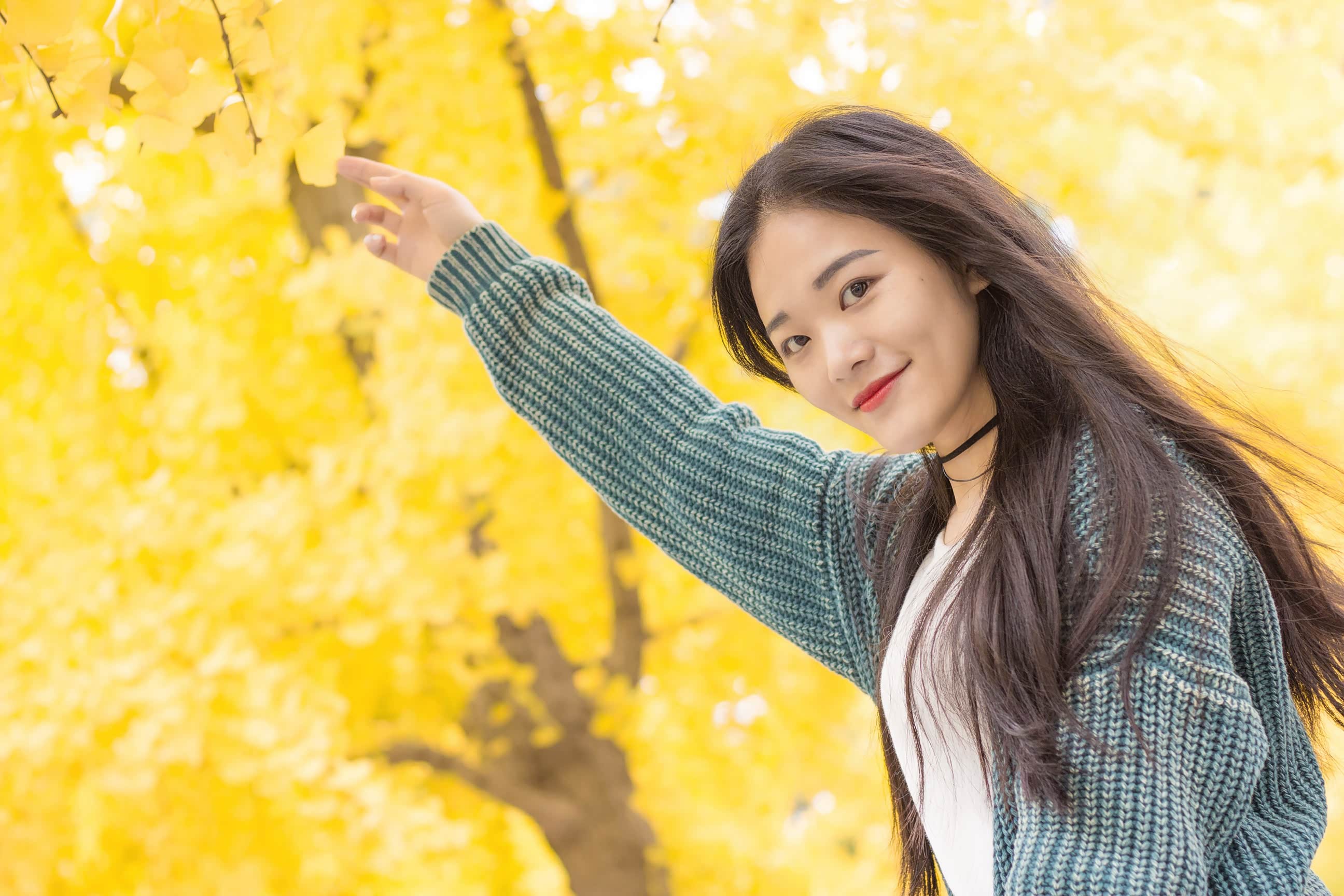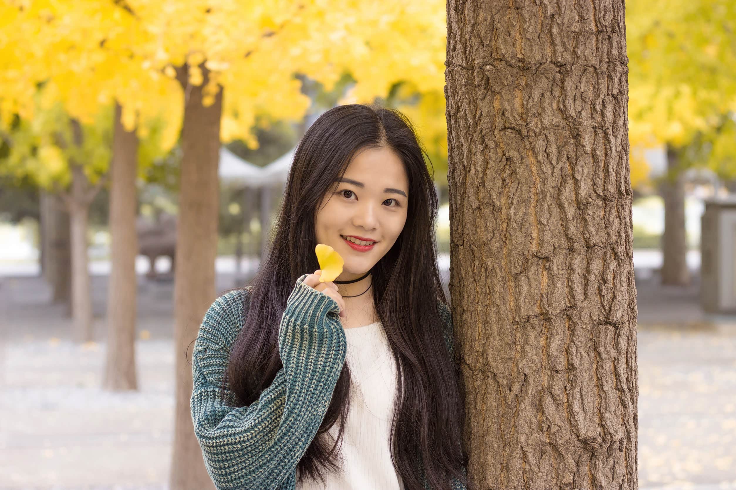 接下来,跟大家分享一下我们这组人像拍摄思路。因为要去拍银杏树,为了不撞色,在穿搭上选择了白色、绿色、蓝色的组合色系,这样既能突出美景,也能凸显人物。