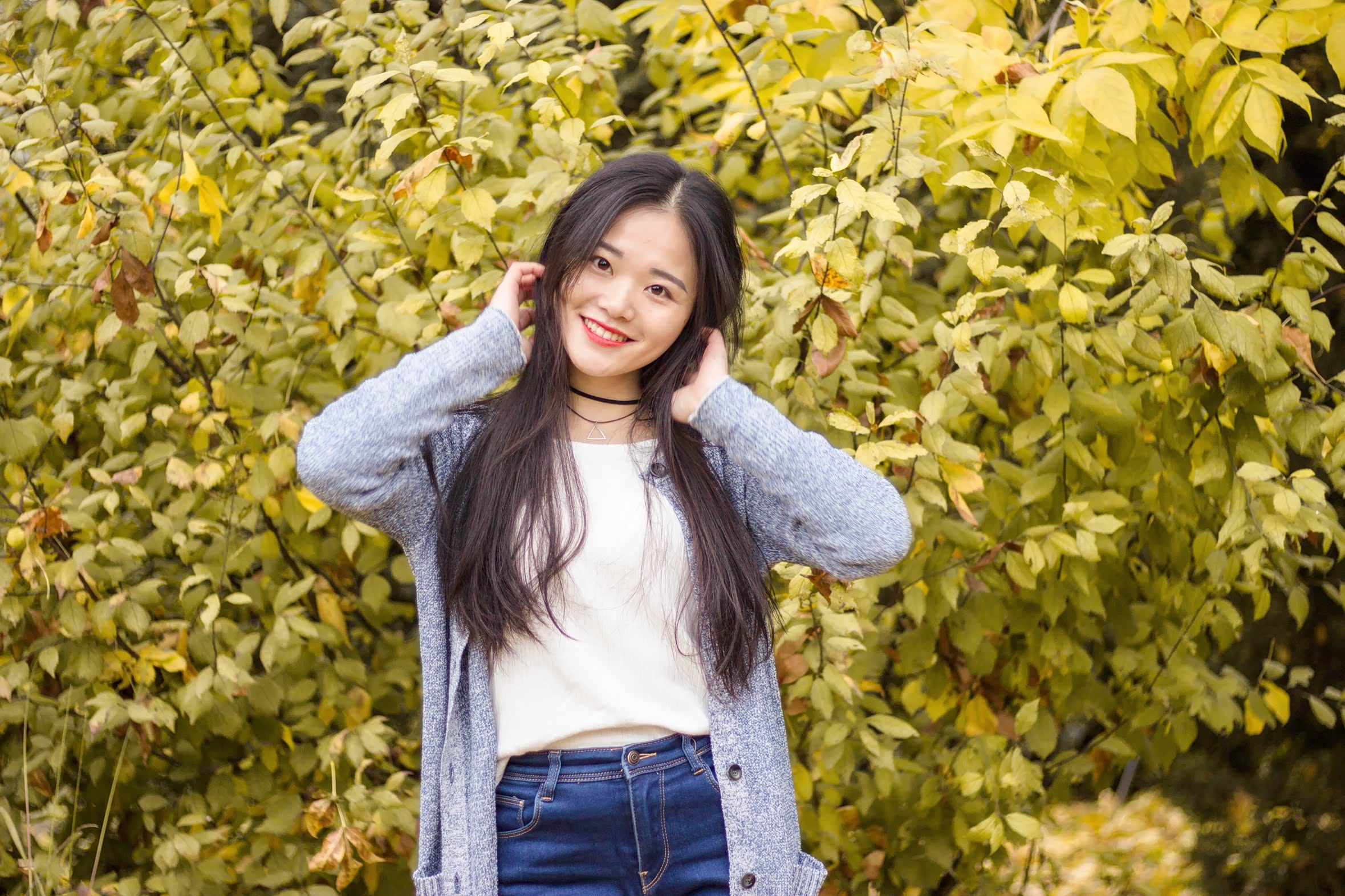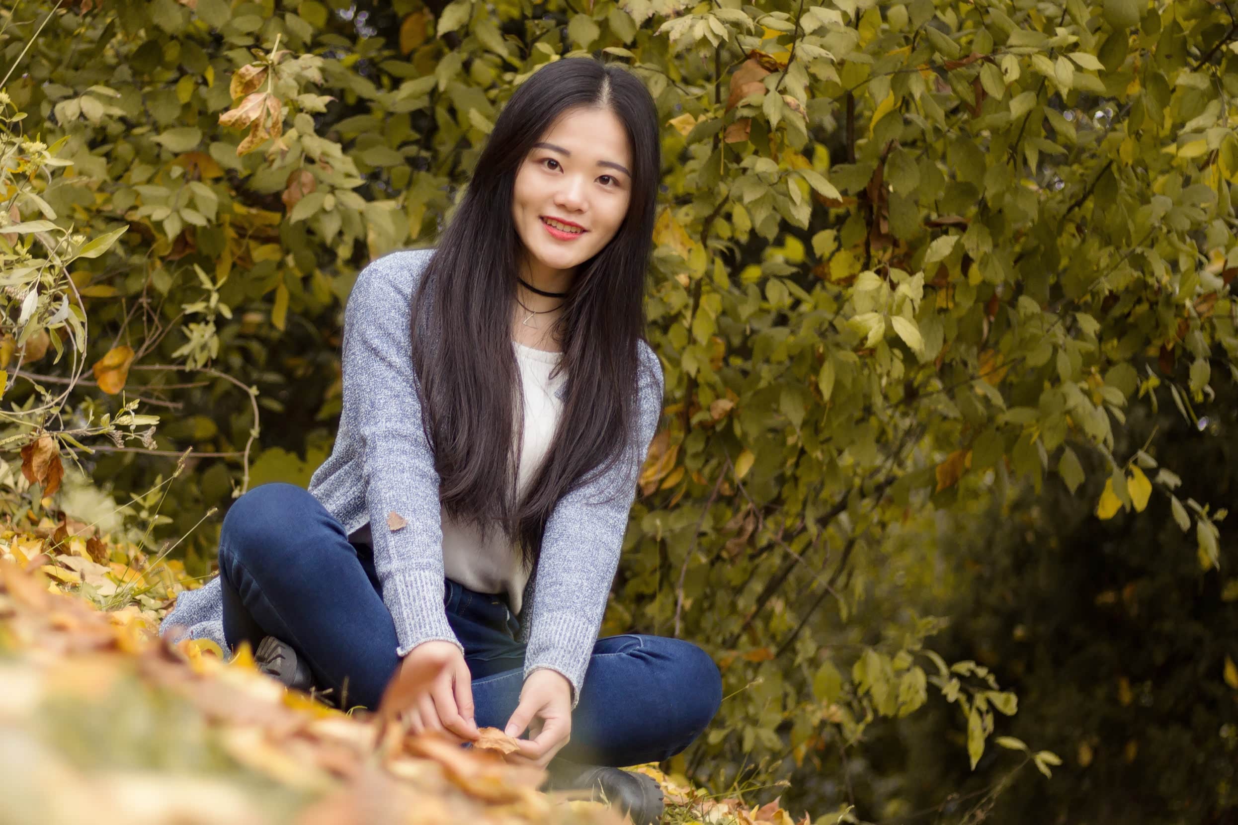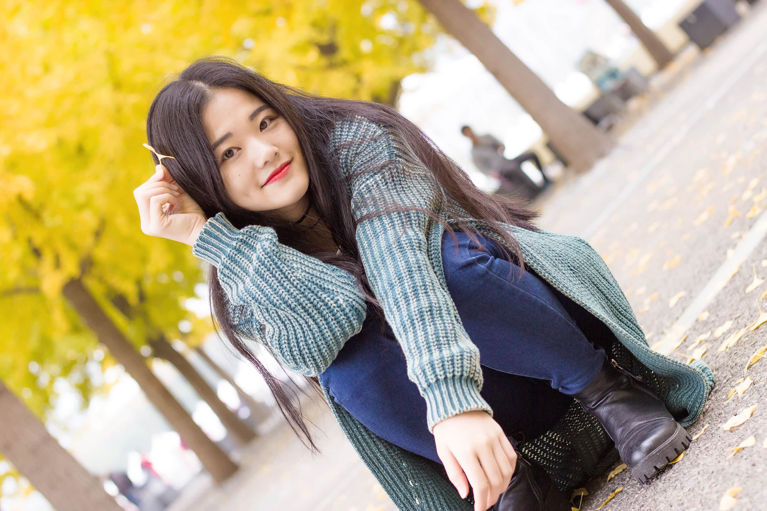 拍人像,个人认为越放松越出片。因此在拍摄过程中,我都是以玩的心态,让摄影师抓拍出更自然的表情。与此同时,可以捡一些落叶当道具,拍出秋日俏皮感。