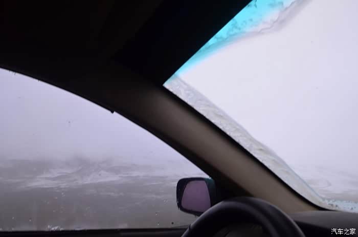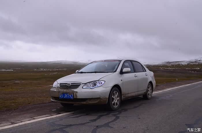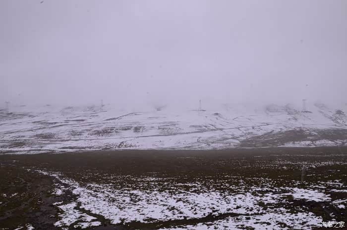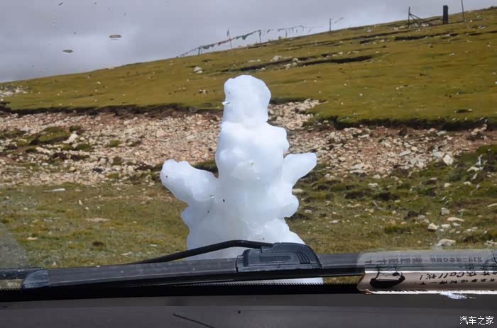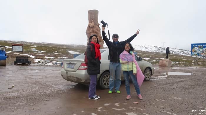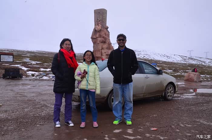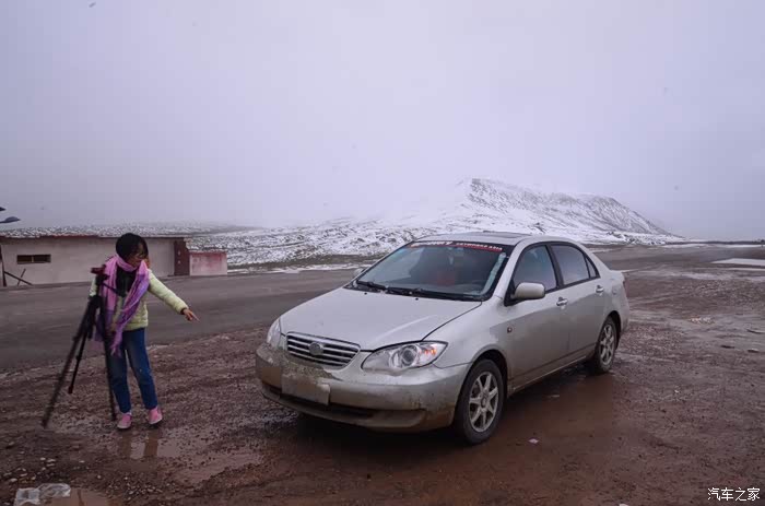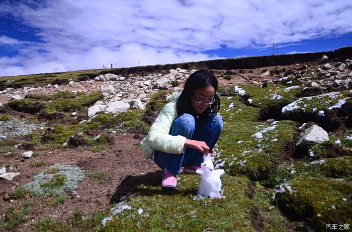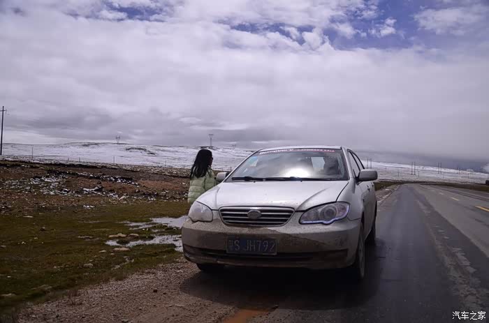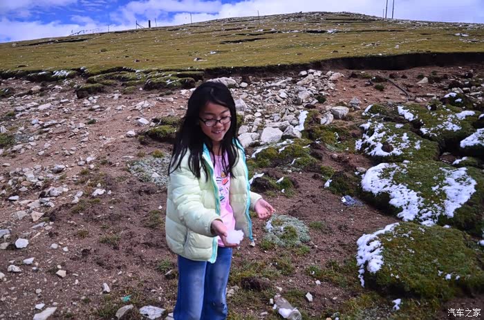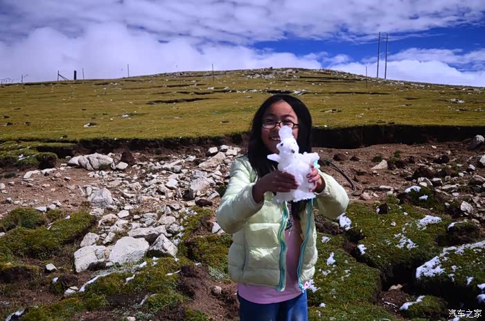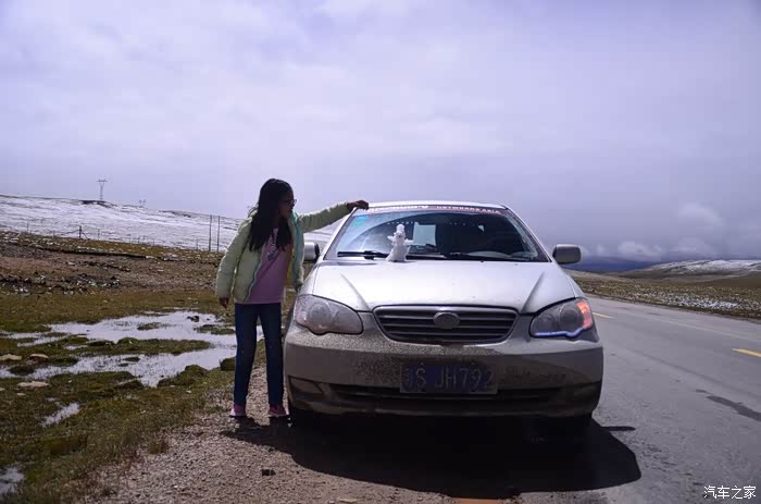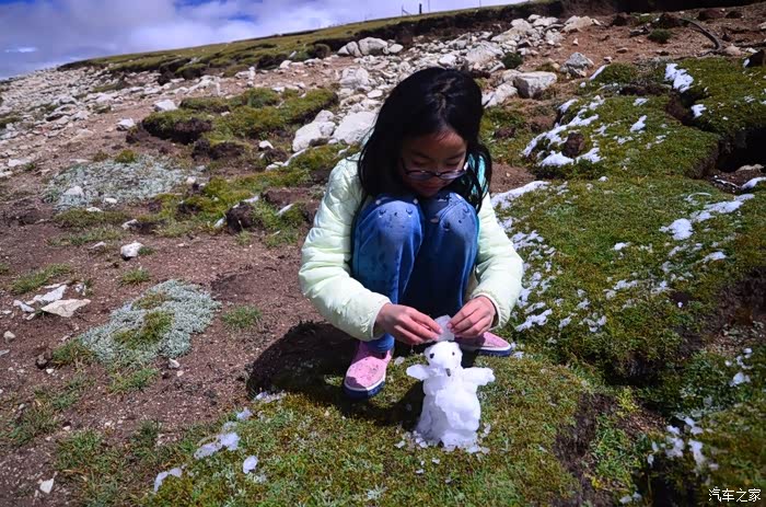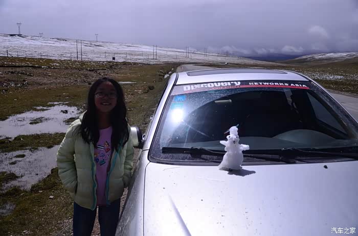 来到唐古拉山脚,前面半山一片浓厚的云向我们移来,开始没觉着什么,后来才发现是下雪不是下雨。在我们开始冲坡的时候,大雪开始飘洒了,第一次在大风雪中驾驶,开始还是挺兴奋的,走着走着感觉雪没有停下来的意思,而是越来越猛烈,对面来的大卡车身上已经是满身积雪。雪花洋洋洒洒地下着,如响箭般射向我们,感觉是在在看一部3D大片,满眼的箭头朝我们奔来,最后被小三挡在了前面,好不刺激!雪依旧在下着,小三也不肯低头,兴奋地带着我们往山上冲,可是前挡上的雪越来越多,雨刮也开始吃力了,更可恶的是玻璃上开始起雾了,第一次见这阵势开始有点不知所措了,后来直接把风速开导了4档才勉强应付过来,然后试着把空调的温度逐步往上调,用暖气对付雪花才是正道。就这样一口气冲上了山顶,可喜的是到了唐古拉山垭口,雪开始停下来了,估计刚才的那片雪云是从这上面下去的,四周白茫茫的一片,银装素裹,有点山舞银蛇、原驰蜡象的感觉。停下车来,外面一切都那么的寂静和安详,可是出来车外,风却萧萧而过,看着小三满脸的泥巴和雪渣,一股感动油然而生,女儿也好不心疼她,下来特意为她拍了写真,擦去满眼的冰块!外面很冷,拍了一通照片准备离去,来了一辆车一个女孩带着一只猫出来旅行,酷毙了!