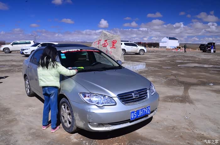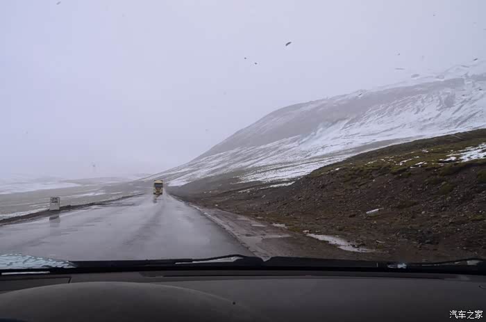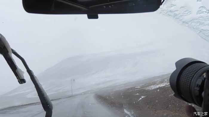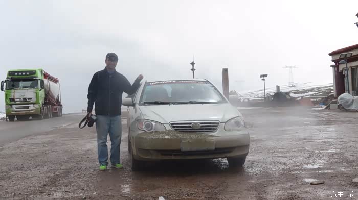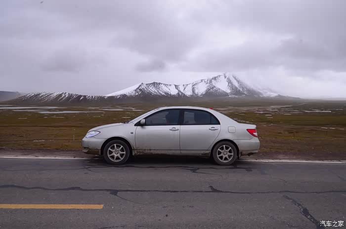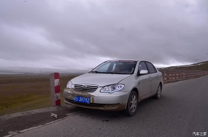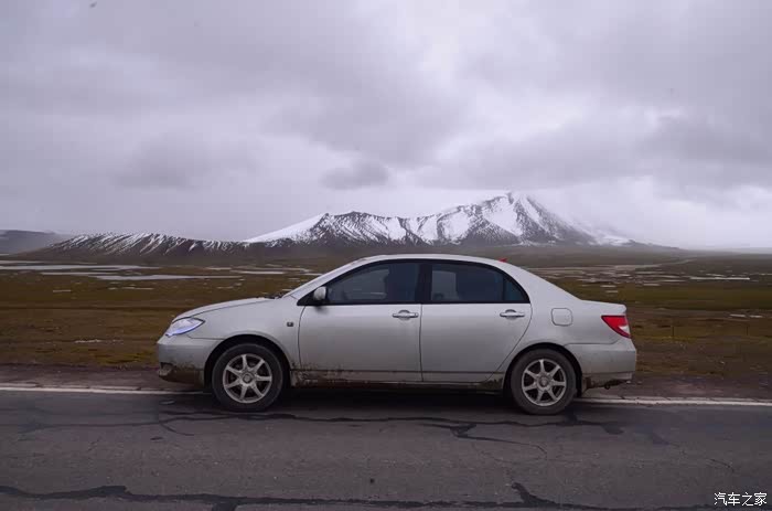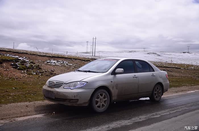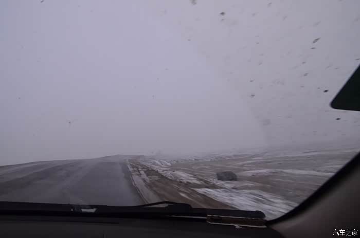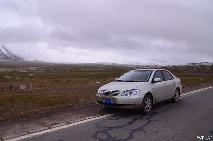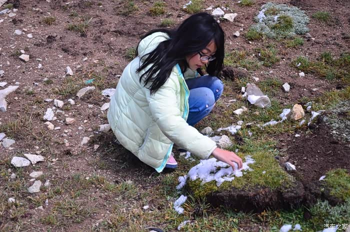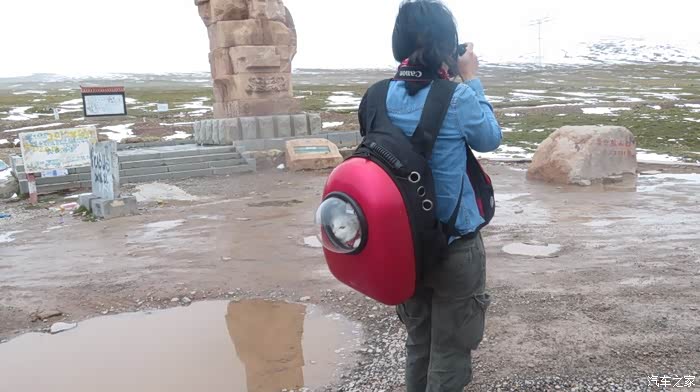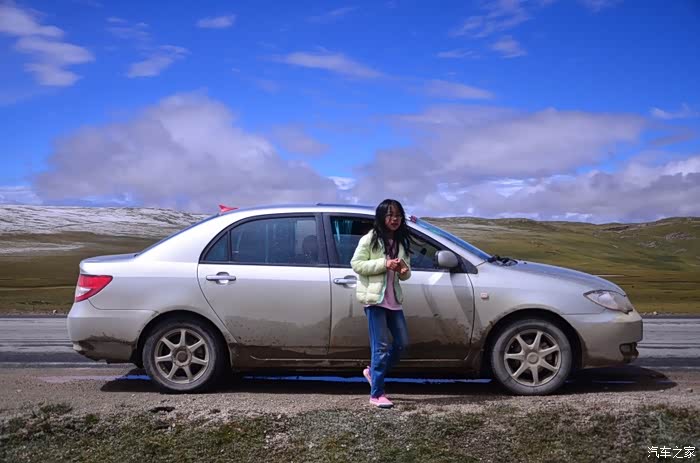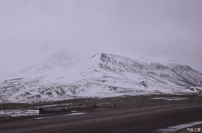 来到唐古拉山脚,前面半山一片浓厚的云向我们移来,开始没觉着什么,后来才发现是下雪不是下雨。在我们开始冲坡的时候,大雪开始飘洒了,第一次在大风雪中驾驶,开始还是挺兴奋的,走着走着感觉雪没有停下来的意思,而是越来越猛烈,对面来的大卡车身上已经是满身积雪。雪花洋洋洒洒地下着,如响箭般射向我们,感觉是在在看一部3D大片,满眼的箭头朝我们奔来,最后被小三挡在了前面,好不刺激!雪依旧在下着,小三也不肯低头,兴奋地带着我们往山上冲,可是前挡上的雪越来越多,雨刮也开始吃力了,更可恶的是玻璃上开始起雾了,第一次见这阵势开始有点不知所措了,后来直接把风速开导了4档才勉强应付过来,然后试着把空调的温度逐步往上调,用暖气对付雪花才是正道。就这样一口气冲上了山顶,可喜的是到了唐古拉山垭口,雪开始停下来了,估计刚才的那片雪云是从这上面下去的,四周白茫茫的一片,银装素裹,有点山舞银蛇、原驰蜡象的感觉。停下车来,外面一切都那么的寂静和安详,可是出来车外,风却萧萧而过,看着小三满脸的泥巴和雪渣,一股感动油然而生,女儿也好不心疼她,下来特意为她拍了写真,擦去满眼的冰块!外面很冷,拍了一通照片准备离去,来了一辆车一个女孩带着一只猫出来旅行,酷毙了!