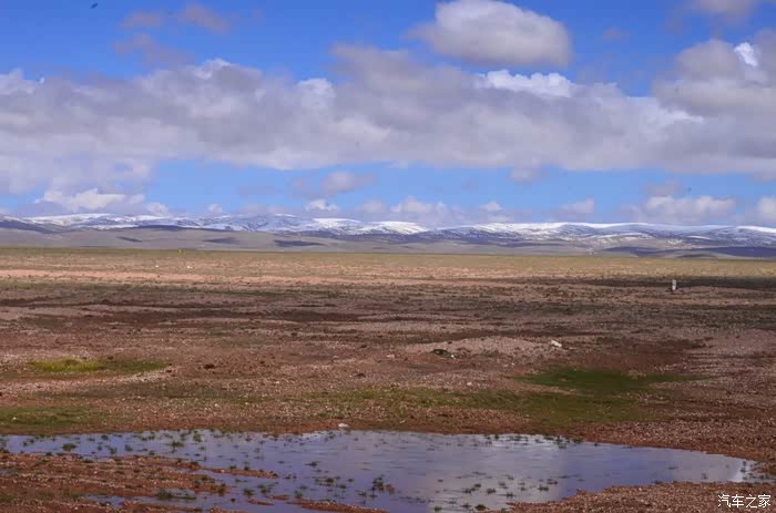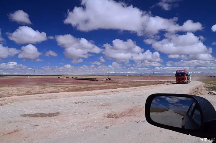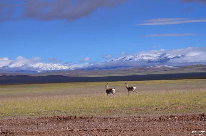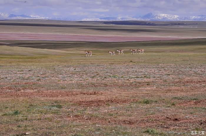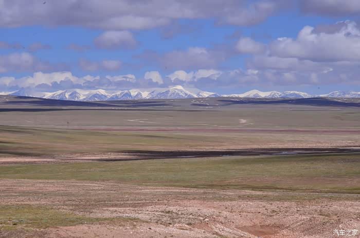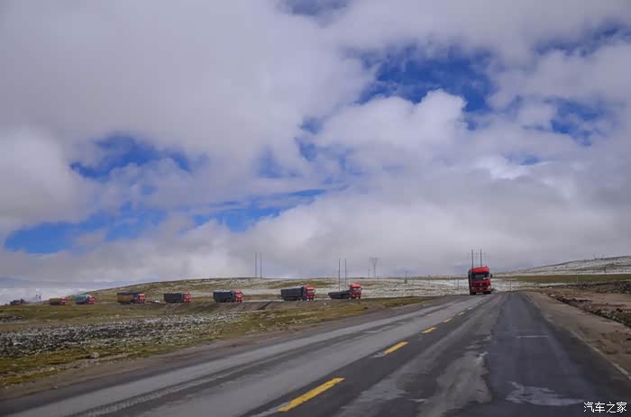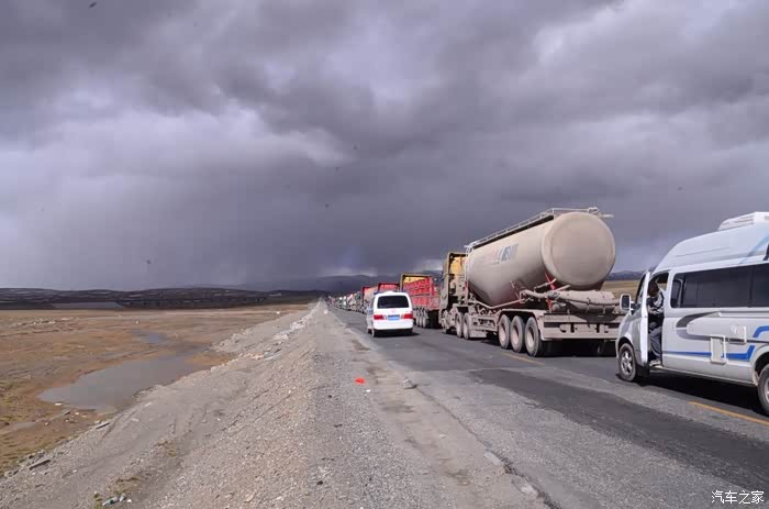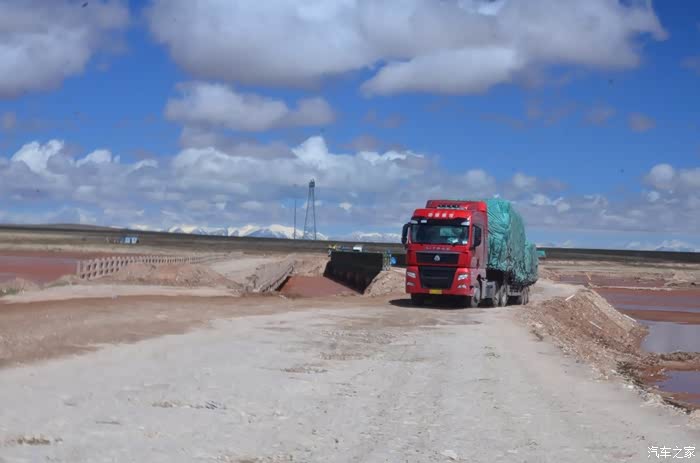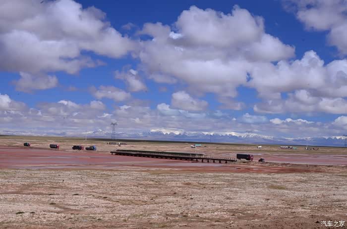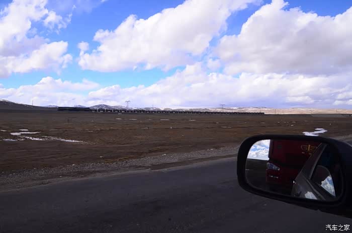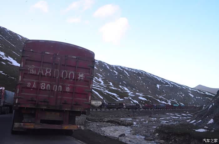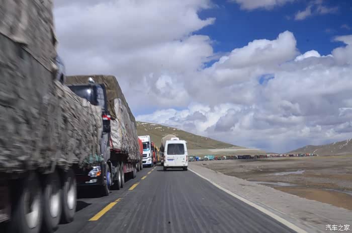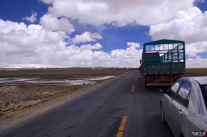 回到我们自己的行程上来吧,今天的主题是塞车,体会了一次刻骨铭心的G109塞车!我们吃完早餐,告别老板,当然也谢谢他的善意提醒,沿格尔木方向出发,过了小镇的桥(沱沱河),说这边是三江的源头,有个水文观测站,没什么兴趣下去了,过了桥就是可可西里的藏羚羊保护区了,苍茫的草地上远处是群山连绵、白雪覆顶,头上是蓝天却少了白云(这边有点奇怪,只有天边群山的是否有一圈云朵,天空明显没西藏那边干净),成群的藏羚羊时不时出现在眼前,见车来了又很快又奔跑开了。G109还有一条与之平行的青藏铁路,就是这对难兄难弟为青海和西藏的经济建设、国家和平和物资运输作出了极大的贡献,偶尔你还能见到火车在两边奔腾,车上有绿色的车厢,也有坦克大炮什么的。可可西里在沿途有好几个观景台和保护站,过了可可西里救护站和观景台,一座大桥被大水冲毁了,从左边临时搭建了工兵桥,桥的四周全是红色的泥沙,河里全是红色的泥沙水,铁桥的桥面是很平整,但是两端的连接路是非常的糟糕,大坑连连,慢慢地走了很久才重新回到G109上来。然后,然后就是悲催的一天开始了,无尽的卡车排成了一条长龙出现在了我们的面前,一看就是塞车了,没办法,两边都这样。估计很多昨天的塞车都还没疏通,昨天大雪有些大货车坏了后就塞了很多车子,一直到过了昆仑山才通畅。塞车持续了七八个钟头,后面的来车有些等不及了,越野车开始下了G109走草地上的野路,我们有自知之明就不去凑热闹了,后面见到的事情也证明了我们的想法是对的,一辆白色科鲁兹跟越野车走了一段野路后被一条河流给难住了,试了很多次都不敢过最后还是乖乖掉头回去,另外一辆极光和陆巡,从后面的野路上来的,到了我们塞车的位置野路的前面是一个大水塘,其实我觉得4驱车可以过去的没问题,可是他们又怕死了,想从路基硬冲上G109来,最怕的就是霸王硬上弓啊,极光在前面冲了好几次都没能成功,看着车子底盘被刮得那个厉害,心疼啊,后面是陆巡先上来了,极光硬生生后退加速靠惯性冲了上来。好吧,想想我们自己从措勤到来多乡的时候也何尝不是这样,不顾一切的冲,可以理解,可是我们也不得极光哥任性啊,我们那时身不由己,绝不是任性!