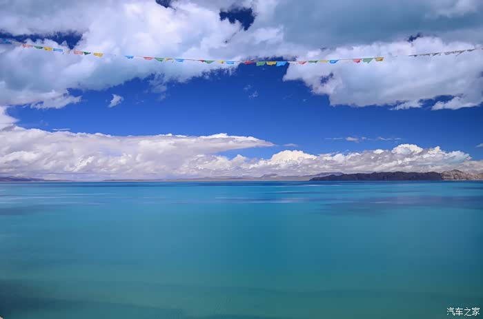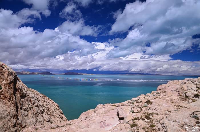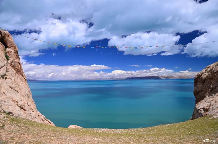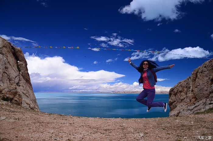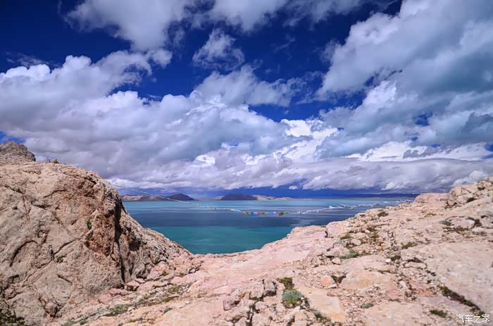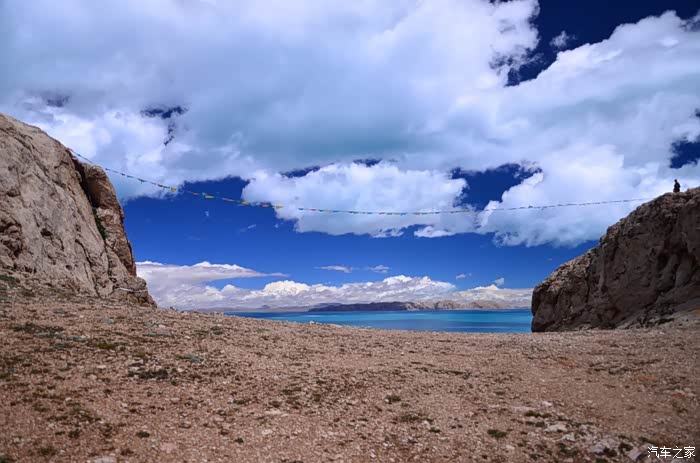 现在湖的四周都在加围栏,在和错愕相连的地方我找了个口子,不顾一切的冲了进去!里面现在应该是在建度假村了,很多货柜式的屋子正在搭建,不过今天没人,我们可以好好放肆一把!把车开到了靠左的一个山头,停好车步行上山顶,刚好一群大学生在此,暑假来西藏支教的,很快就要回去了,抽时间来色林错看看,舍不得这个美丽的地方,是的,离别是不舍的,更别说是这样美丽的地方!山坡的石头上尽是越野车黑色的胎印,到了山顶,映入眼帘的是个U型的口子,他们告诉说这是色林错的天门,上面拉着一条五彩的经幡,飘飘荡荡,要把我们带入这神秘的错中。站在山头,就像站在了泰坦尼克号的船头,伸开双手却没有呐喊的欲望,而是平静地吹着湖风,在这蓝色的海洋上沉思,是的,我必须称之为海洋,因为她如此的浩瀚,如大海一般波澜壮阔,却比海洋更深邃、更梦幻,沉思是因为神圣,置身于这样的蓝色中,你没有了脾气和个性,是的半点都没有,这是普度众生的圣湖,你会被一种力量,一种神奇的力量牵引和控制着,往湖的中心和彼岸驶走,很快你离天堂越来越近,有点窒息的感觉,但是没多久你就会感到呼吸是多余的,于是你恢复了神智,慢慢睁开双眼,那是一个另外的纯净世界,没有喧嚣,没有纷争,孩童会把你带到长老的寺庙,被圣水和佛经沐浴着,全身的毛孔开始张开,所有的疑惑和罪恶被排除体外,一股新的真气从头注入,没了杂念,多了淡定,你终于知道了活着的意义和存在的目的。。。古人说醍醐灌顶和茅塞顿开大概就如此吧!不愿意被大家从幻觉中拉回,可是现实就本该如此,我不能真的做自己,你也何尝不是!