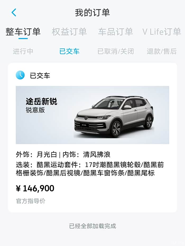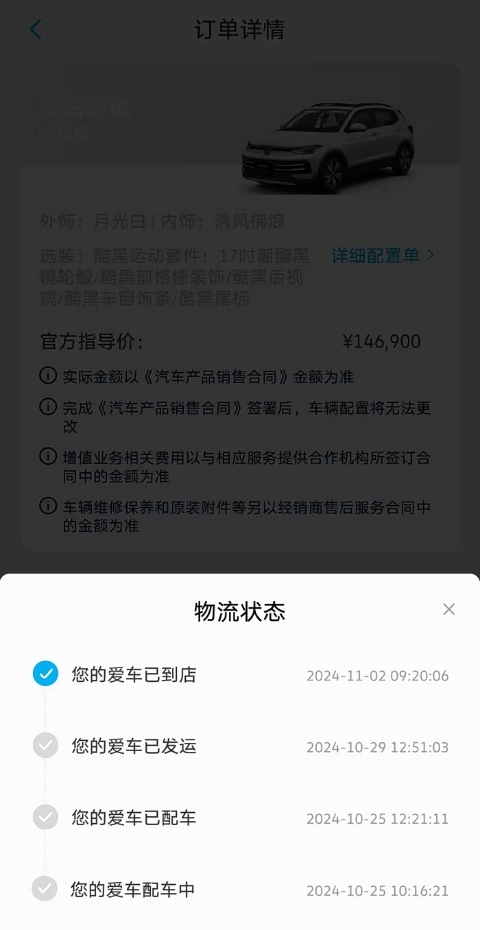 10月中旬到了本地一家比较有规模的4s店,经过试乘试驾,考虑到第二辆车会经常跑高速,对于动力上还是有所要求的,所以选择了新车官方指导价146900元,优惠47000元,99900元的途岳新锐动力更为强劲的1.5T锐意版,外饰月光白,内饰清风拂浪,选装酷黑运动套件,签订了定车意向合同,在我们的软磨硬泡下,答应赠送贴膜、脚垫、毛巾、炭包、车牌框、雨伞,但保险必须店里上,再加上服务费380元。因为途岳新锐没有现车,需要网上下订,线上交了2000元,线下店里交了2000元,共缴纳定金4000元。