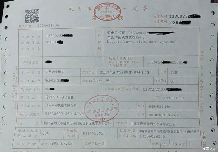 根据定车进度显示,10月25日厂方完成配车,29日发运,11月2日到店,11月4日销售通知车到店,急匆匆和老婆前往提车,看到门口的爱车,兴奋不已和老婆根据清单逐项对车子进行了简单的检查,当然4S店接车时也检查了一遍,我们也走个形式,看看外观漆面、内饰、底盘、各类随车工具等,接着就办各种手续,签了一堆文件后到财务交尾款和上牌服务费96280元,买保险,店里强制上的平安保险,包括交强险、车损险、二百万三者险,驾乘意外险,医保外用药等共5260多。缴纳了购置税8840.71元,最后打完临牌开车回家。
