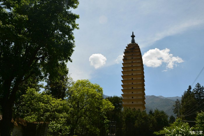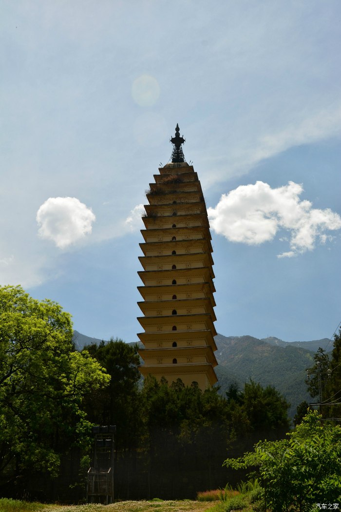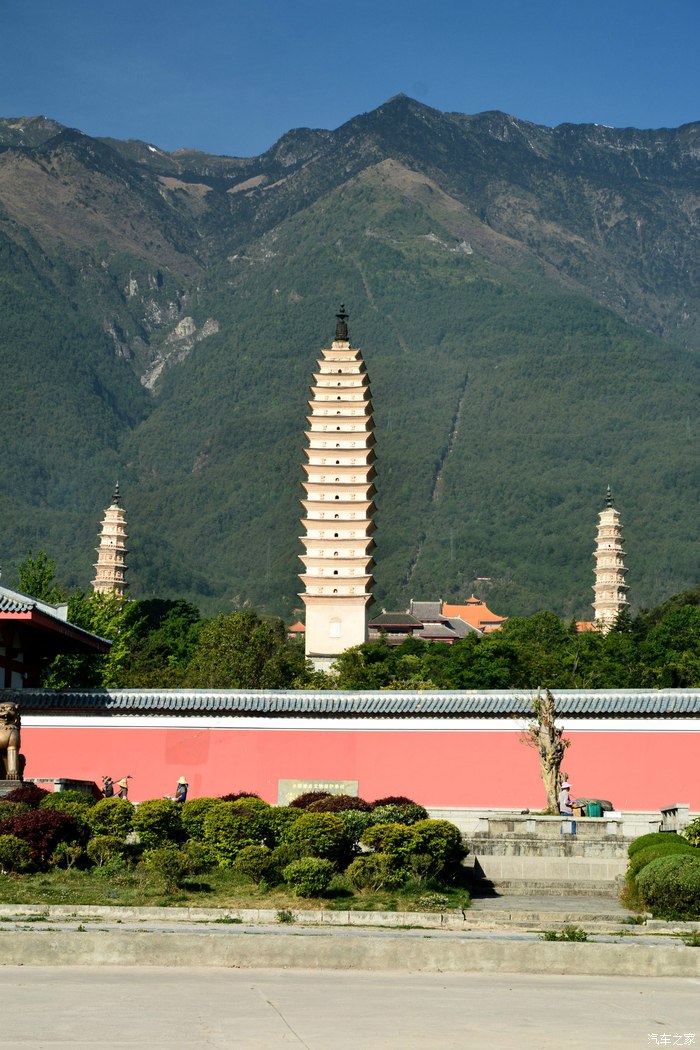 大理崇圣寺三塔,距离大理城1公里。雪峦万仞、镂银洒翠的点苍山峙其后;波涛万顷、横练蓄黛的洱海嵌于前;三塔鼎峙,撑天拄地;玉柱标空,雄浑壮丽,为苍洱胜景之一。“胜地标三塔,浮图秘鬼工。”三塔的主塔名叫千寻塔,高69.13米,为方形16层密檐式塔,与西安大小雁塔同是唐代的典型建筑。塔下仰望,只见塔矗云端,云移塔驻,似有倾倒之势。塔的基座呈方形,分三层,下层边长为33.5米,四周有石栏,栏的四角柱头雕有石狮;上层边长21米,其东面正中有石照壁,上有“永镇山川”四个大字,庄重雄奇,颇有气魄。