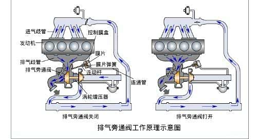 所以,就出现了旁通阀这个装置。当排气涡轮压力过大时,旁通阀就会打开,这样可以让发动机排出的废气不经过排气涡轮直接排出去,这样就可以避免涡轮出现压力过高的现象了。