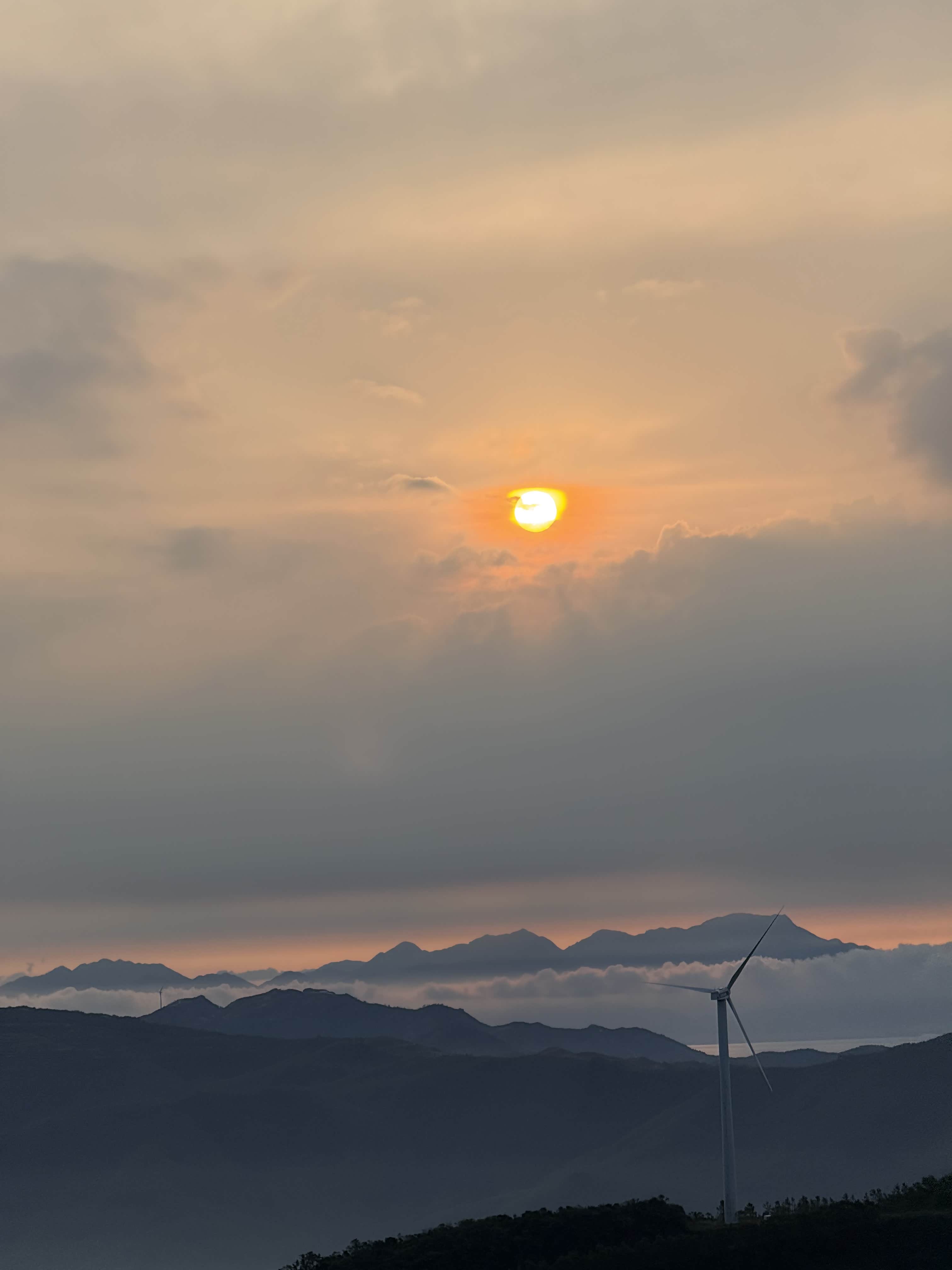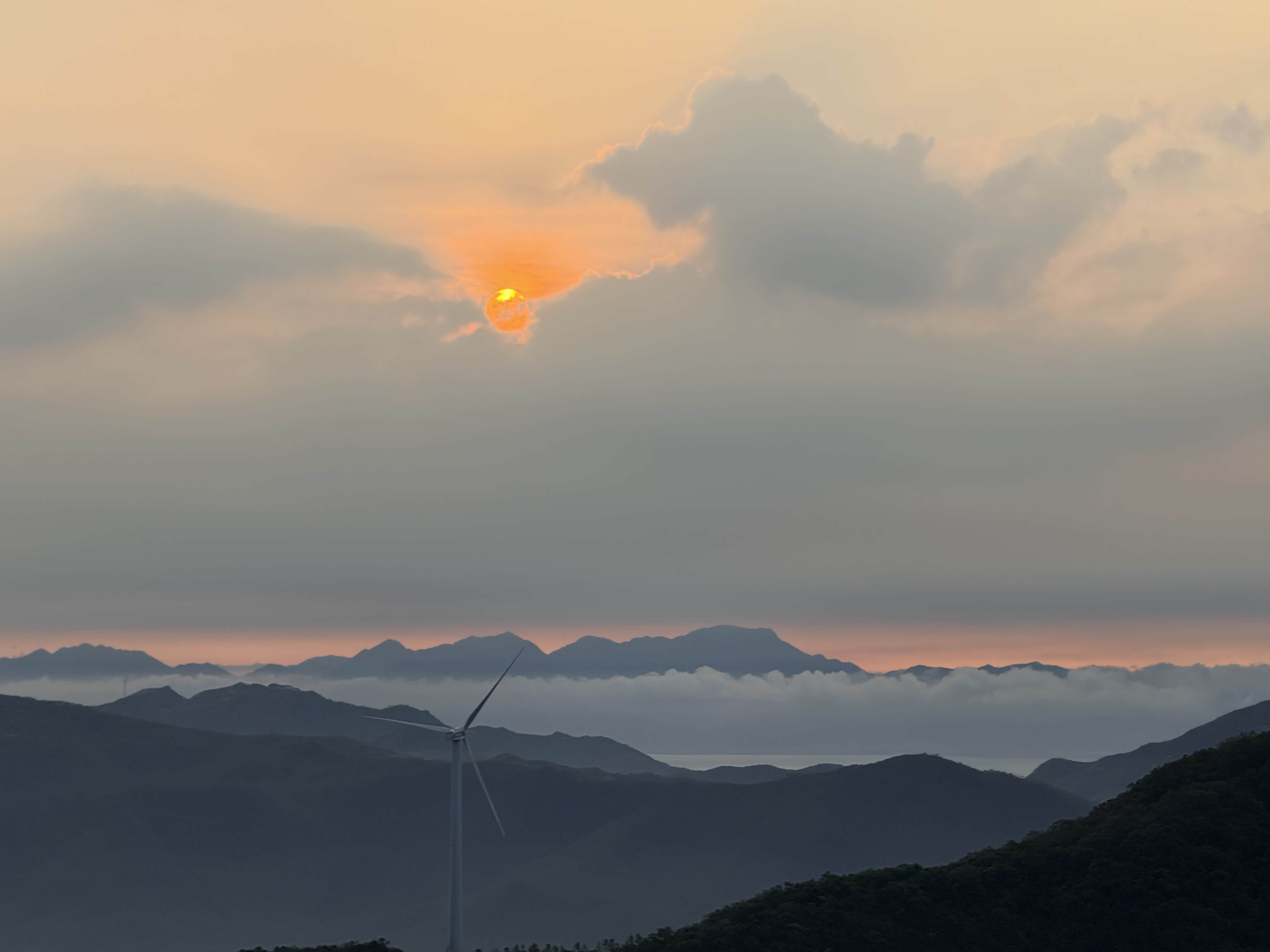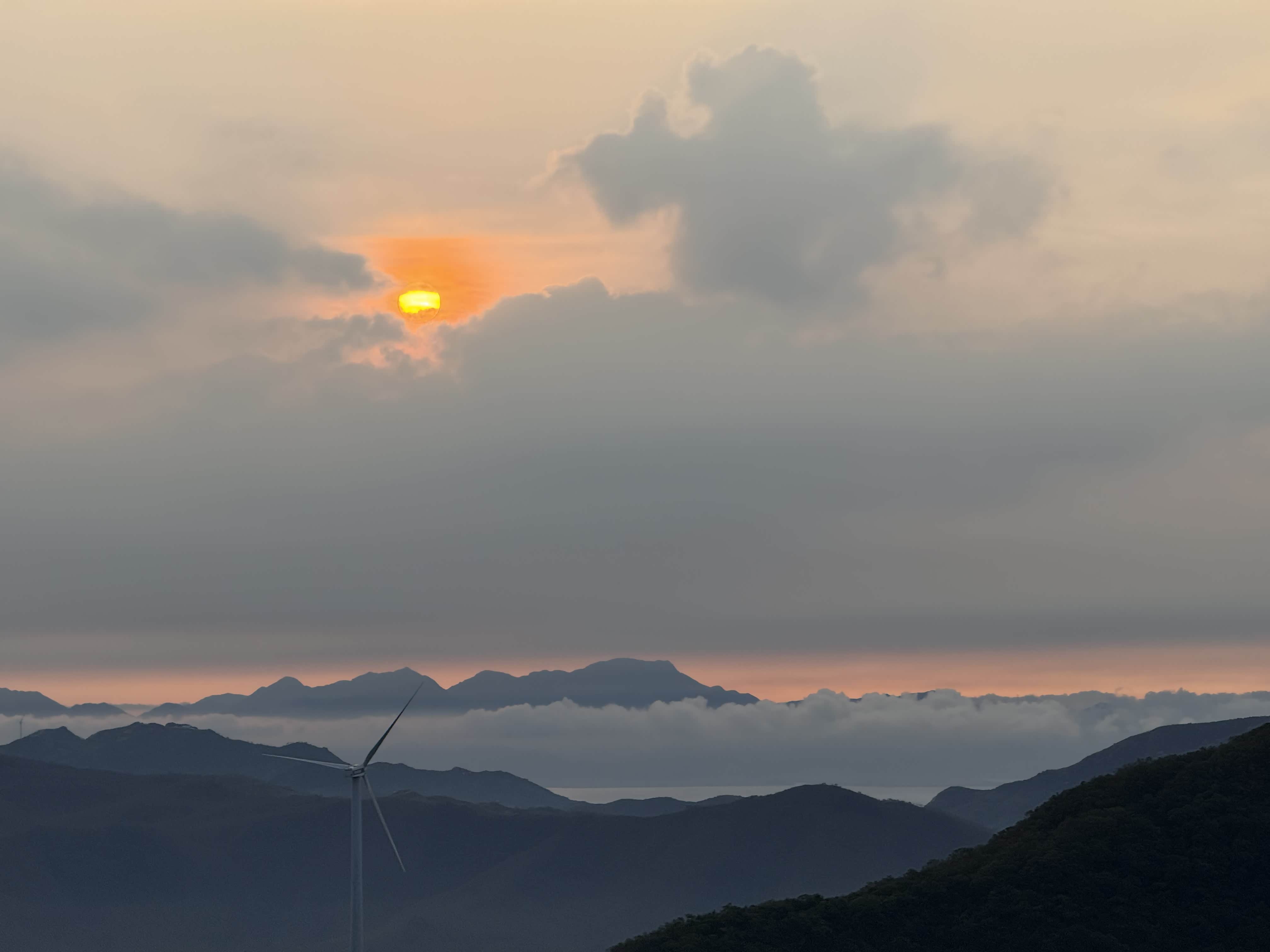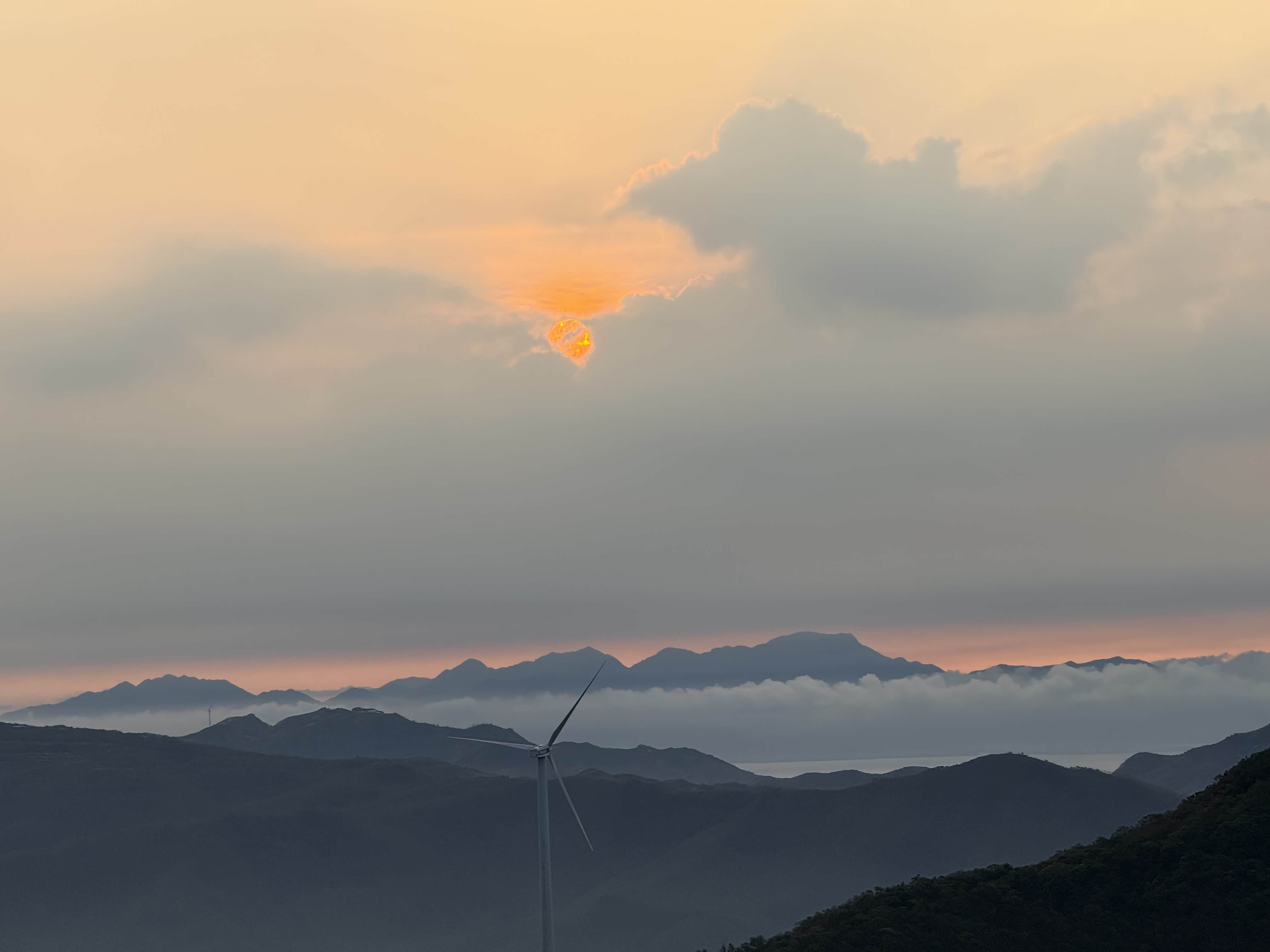 抵达观日点后,我们迅速下车整理装备,选择了视野开阔且相对安全的位置等待日出。此时山顶已有少量游客,大家有序分散,互不干扰。凌晨5点58分,东方天际开始泛起微光,逐渐由鱼肚白转为橙红色,云层被染成绚丽的色彩。6点12分,太阳的小半部分从山峦后缓缓升起,光芒逐渐穿透云层,洒在连绵的山群和白色的风车上,风车在晨光中缓缓转动,形成一幅极具美感的自然画卷。全体成员纷纷用相机记录下这一美景,期间相互拍照留念,交流观赏感受,氛围轻松愉悦。