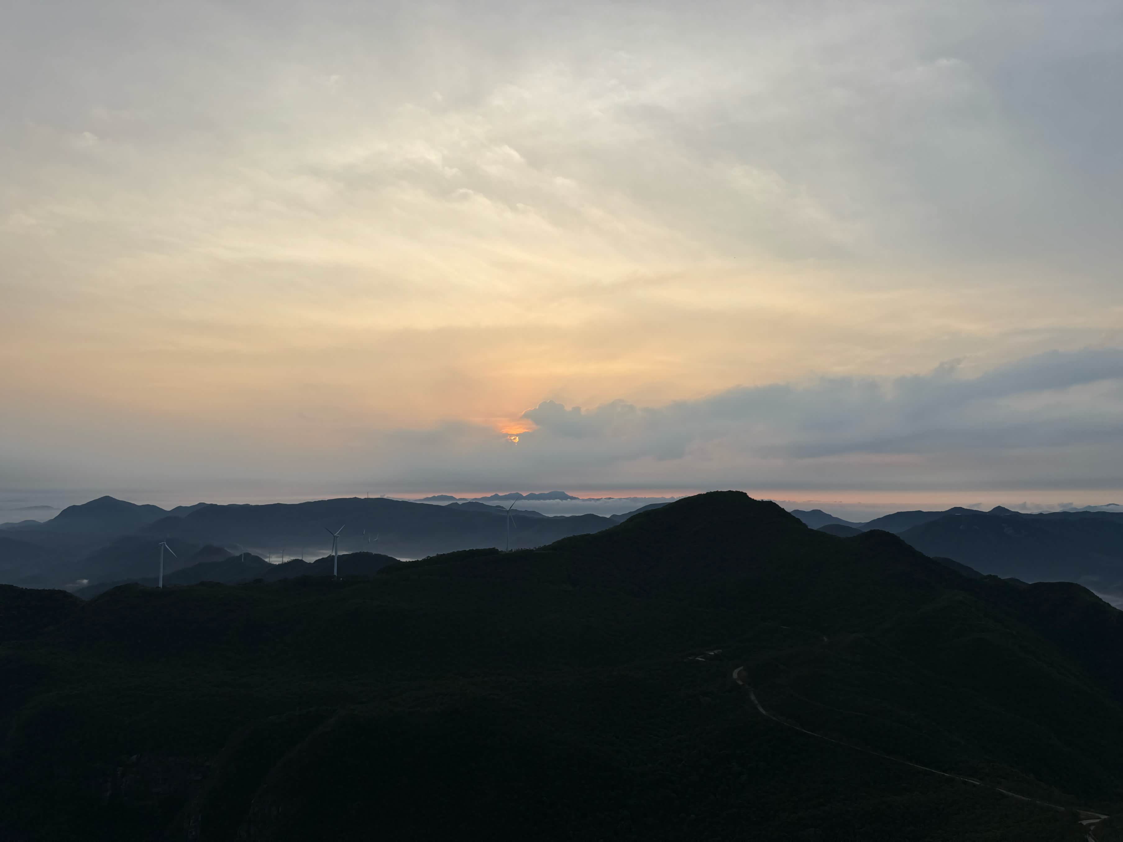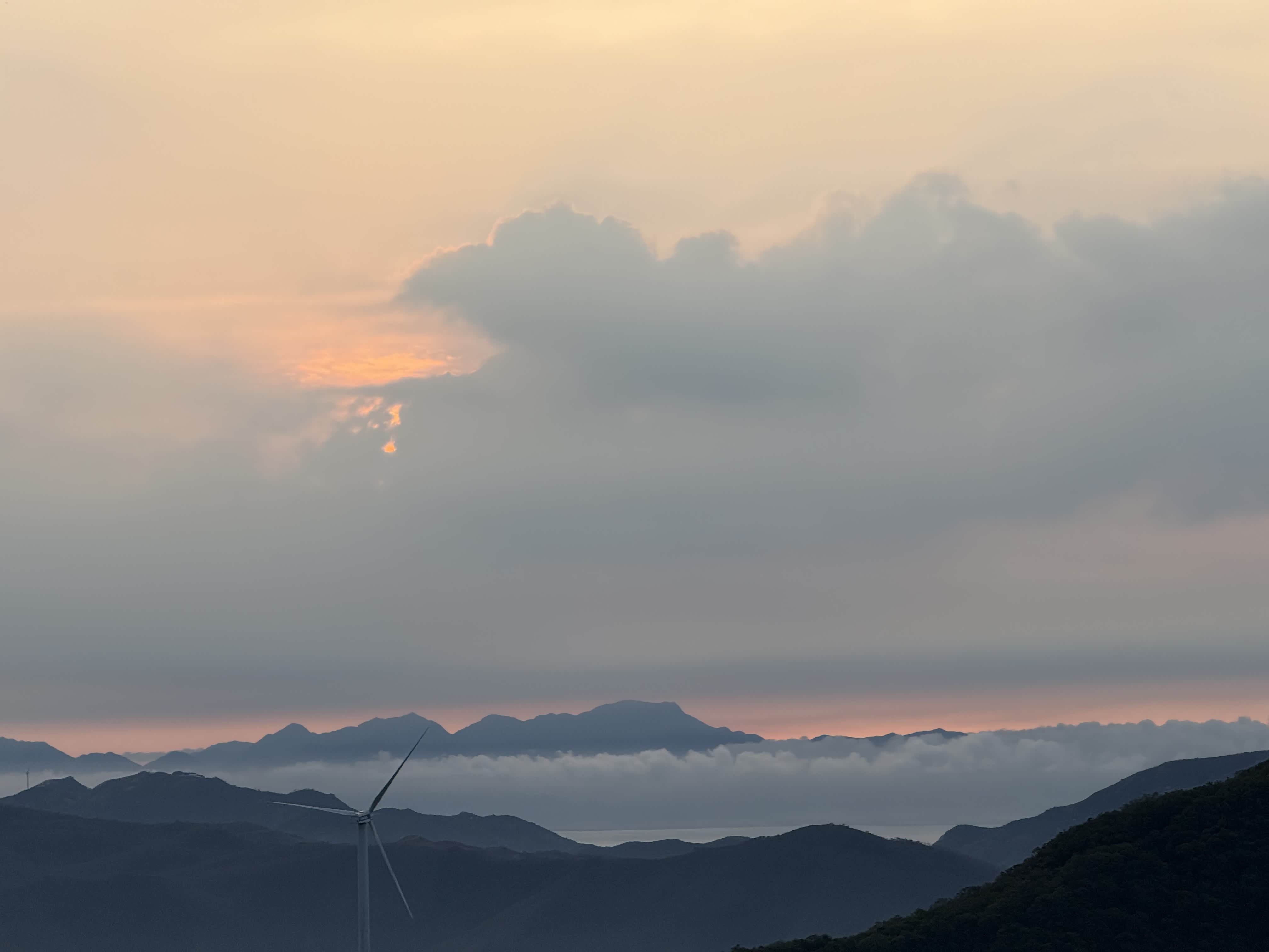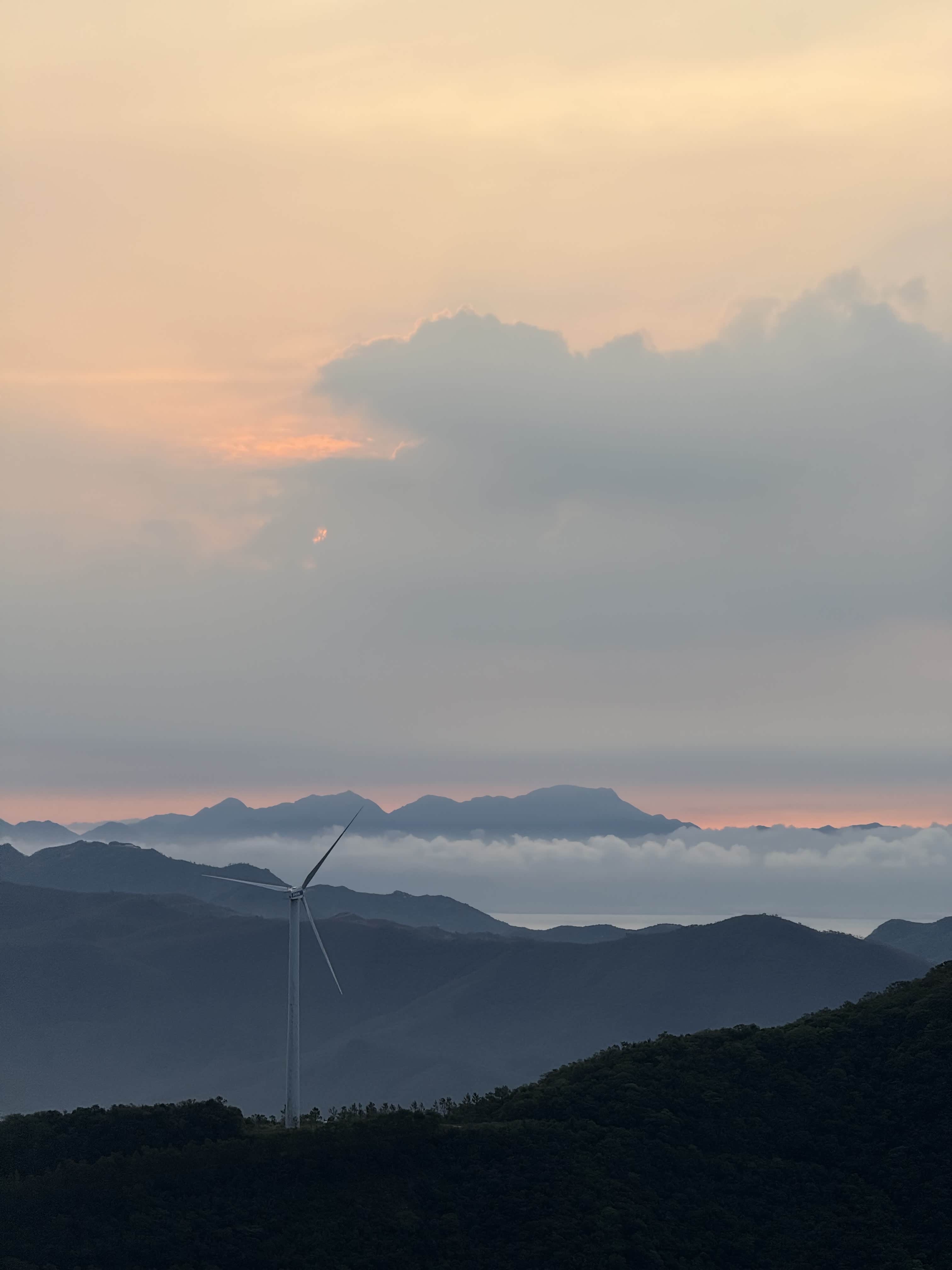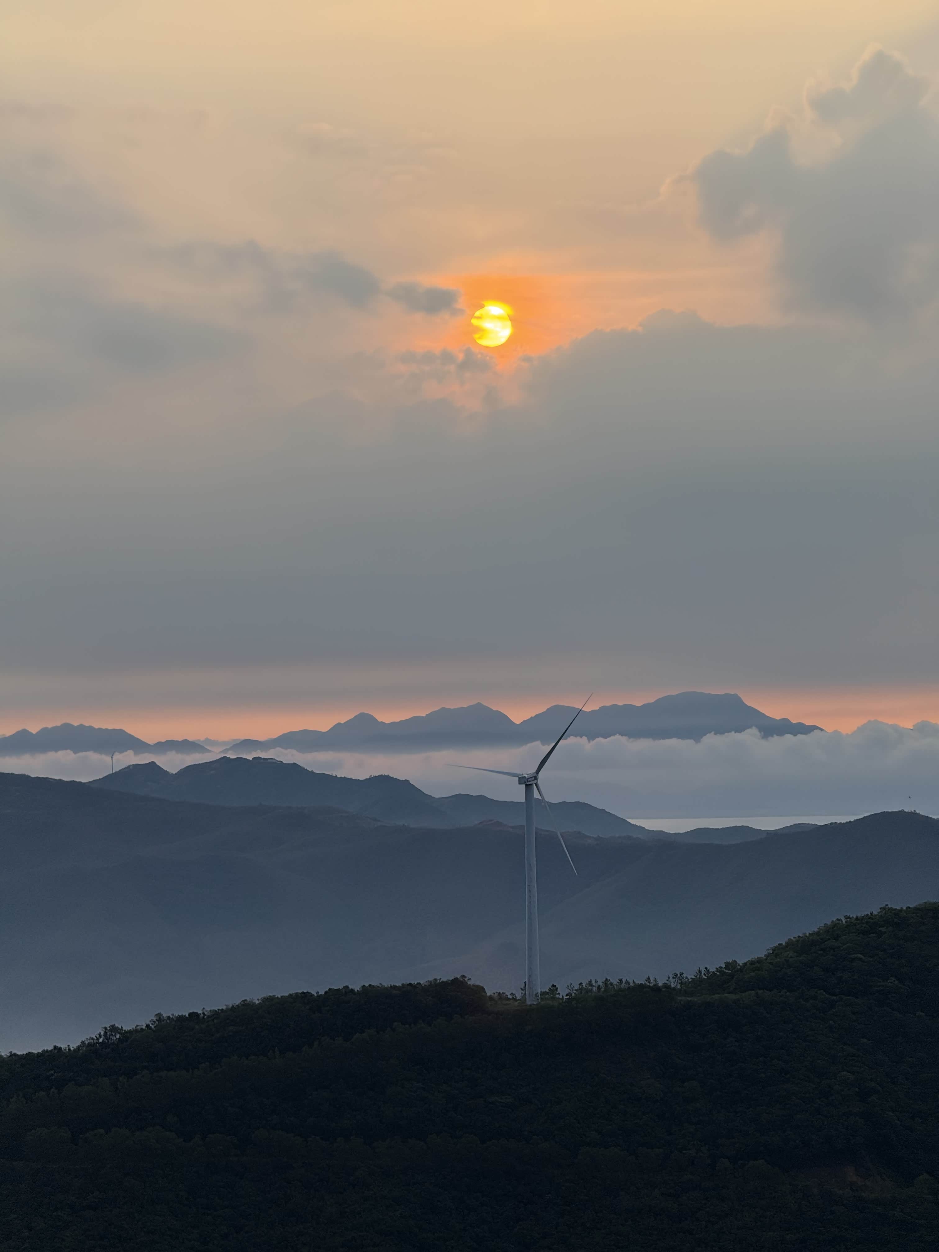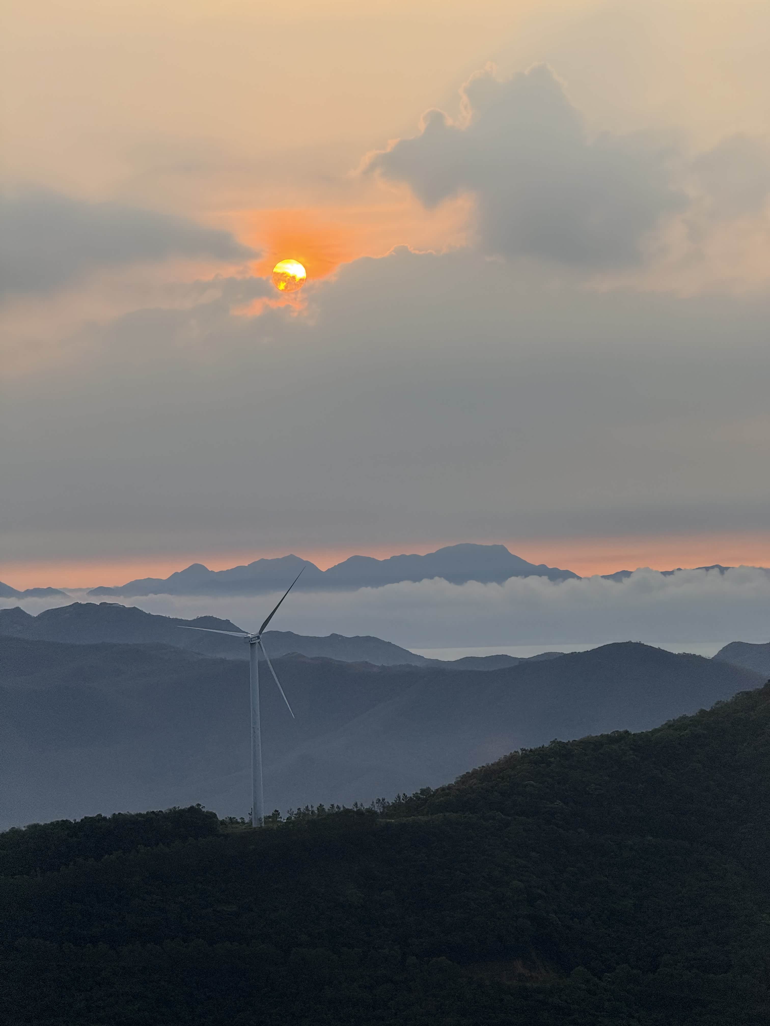 抵达观日点后,我们迅速下车整理装备,选择了视野开阔且相对安全的位置等待日出。此时山顶已有少量游客,大家有序分散,互不干扰。凌晨5点58分,东方天际开始泛起微光,逐渐由鱼肚白转为橙红色,云层被染成绚丽的色彩。6点12分,太阳的小半部分从山峦后缓缓升起,光芒逐渐穿透云层,洒在连绵的山群和白色的风车上,风车在晨光中缓缓转动,形成一幅极具美感的自然画卷。全体成员纷纷用相机记录下这一美景,期间相互拍照留念,交流观赏感受,氛围轻松愉悦。