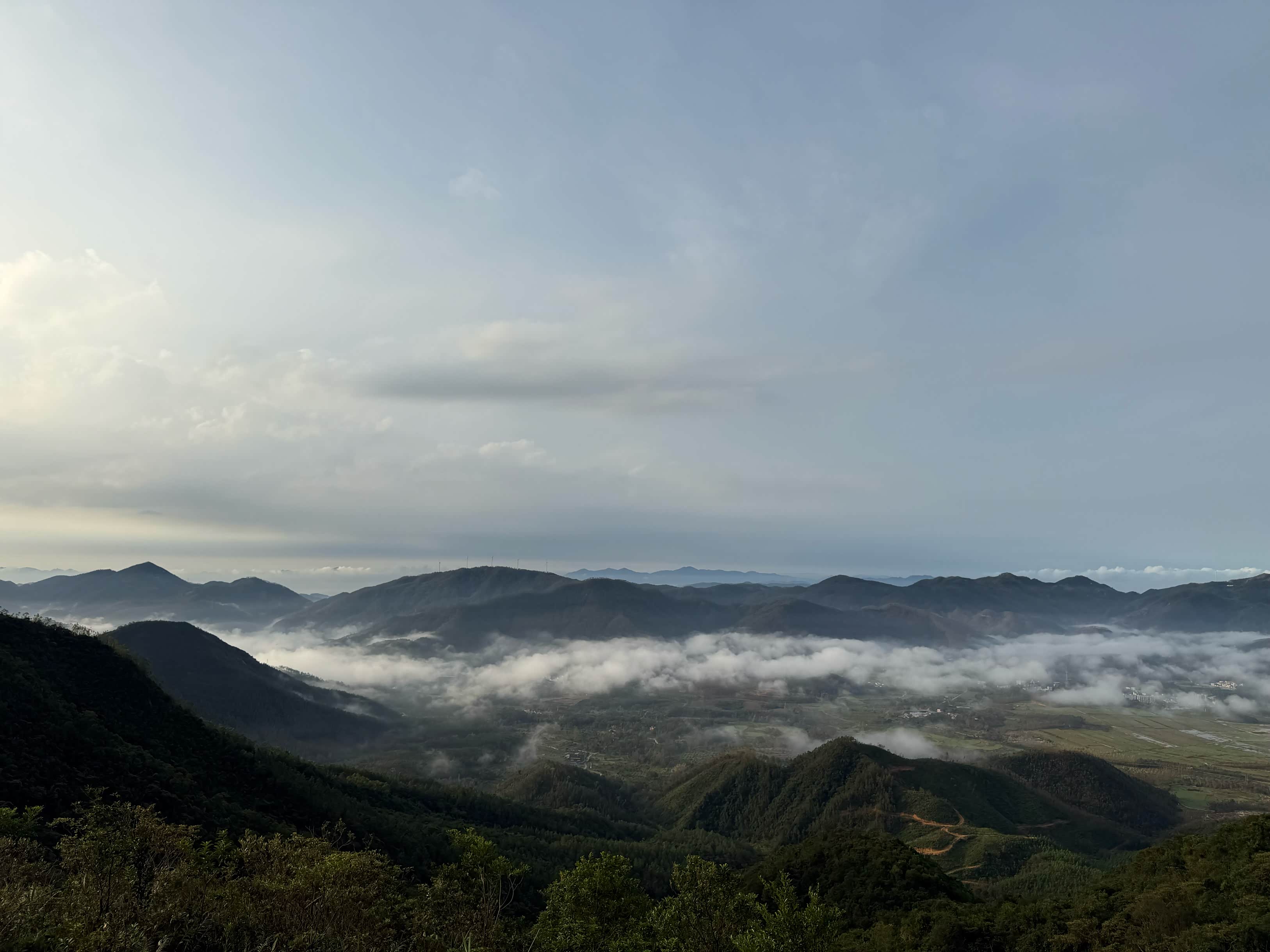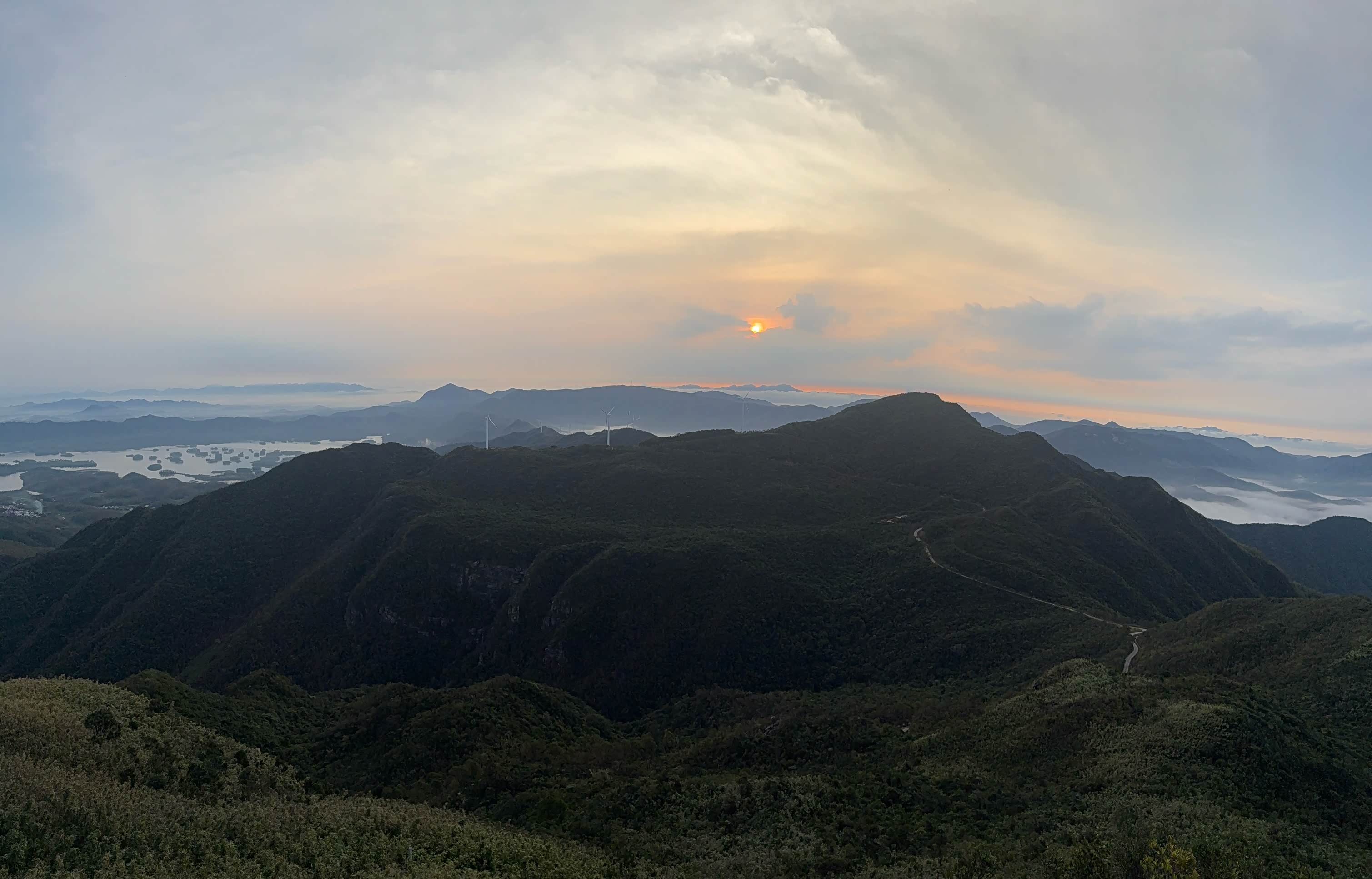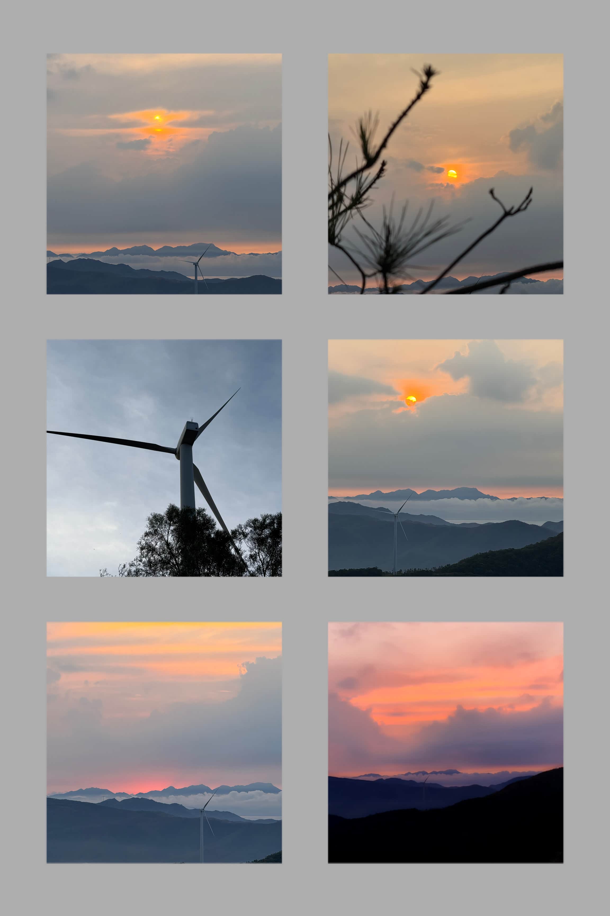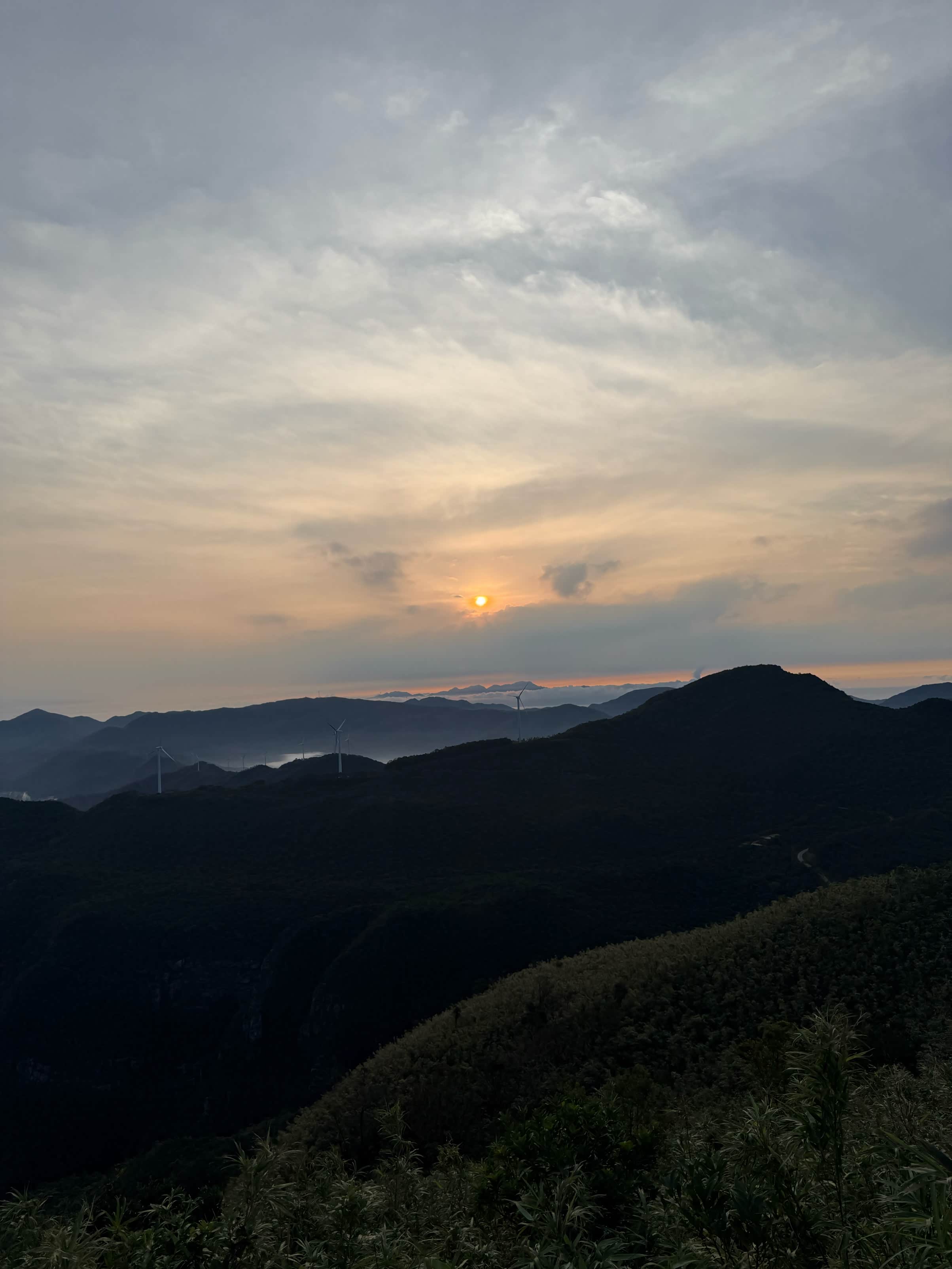 抵达观日点后,我们迅速下车整理装备,选择了视野开阔且相对安全的位置等待日出。此时山顶已有少量游客,大家有序分散,互不干扰。凌晨5点58分,东方天际开始泛起微光,逐渐由鱼肚白转为橙红色,云层被染成绚丽的色彩。6点12分,太阳的小半部分从山峦后缓缓升起,光芒逐渐穿透云层,洒在连绵的山群和白色的风车上,风车在晨光中缓缓转动,形成一幅极具美感的自然画卷。全体成员纷纷用相机记录下这一美景,期间相互拍照留念,交流观赏感受,氛围轻松愉悦。