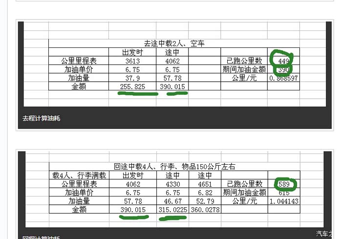总感觉你加的钱数不对,出发时加满这个钱不在统计里,去途中加390元(出发到第一次加油这个路程的油钱),回时加390元(第一次加油地点到你姐姐家这个路程的油钱),回途中1加315元(你姐家到你这次加油的路程的油钱,就是带你父母下馆子时吧),回途中2加360元(下完馆子再基本到家的这段里程)应该都在你跑的里程内花的钱,所以你总共加了390 390 315 360=1455元 公里数就用最后一次的减掉开始的 4651-3613=1038公里