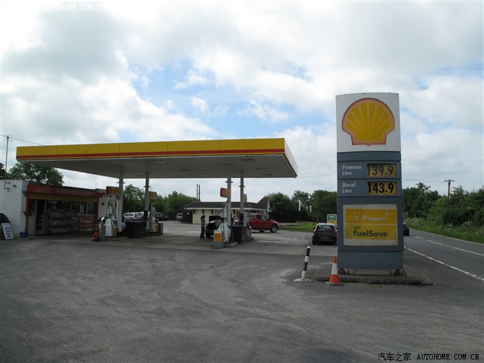 这家壳牌加油站地处郊外,价格稍贵,95号汽油每升1.399镑,柴油每升1.439镑