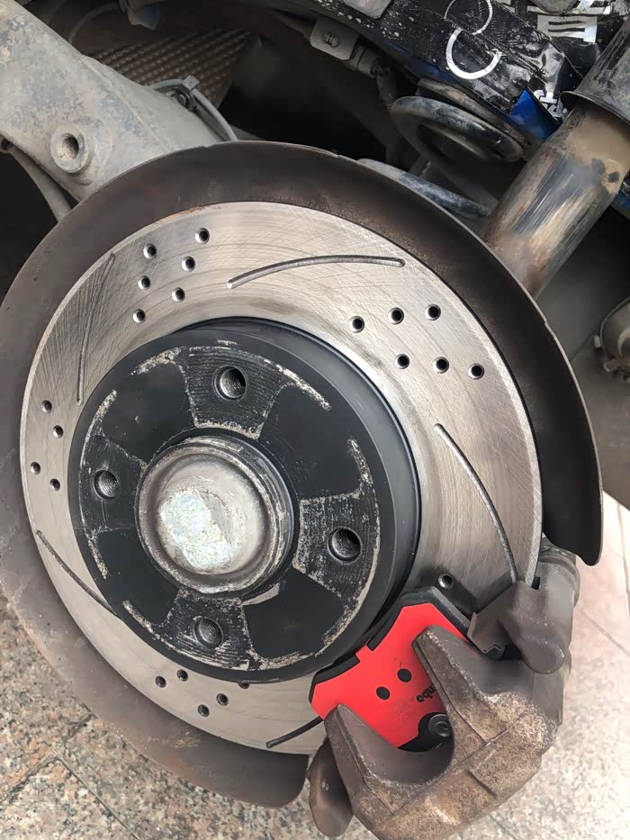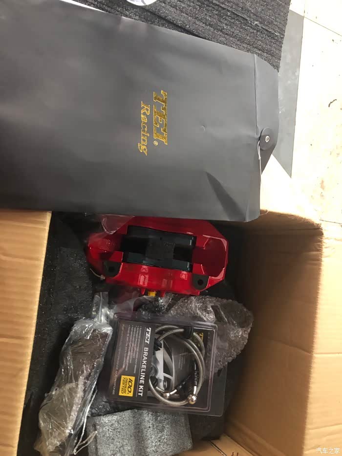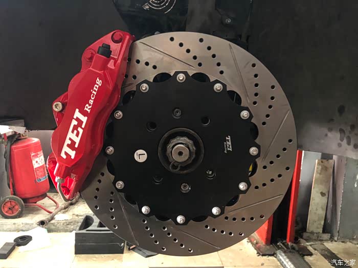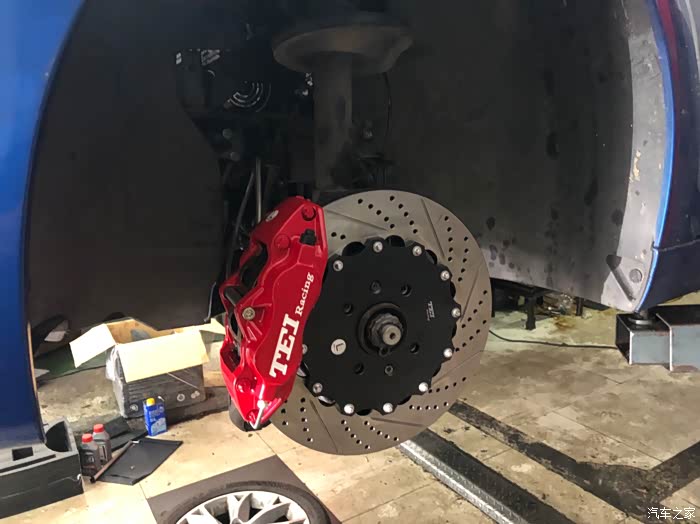 只改轮毂不改刹车?不是我的风格。但是刹车系统真的水!太!深!网上什么样的都有,台产(台州非台湾)的AP,布雷博,我的天2500快就能买到。。。真的1万5仿的2500竟然销量这么高都,刹车是人命关天的是,买这些刹车的不是在交智商税么?经过各路大神推荐,网上资料翻阅,最后定下TEI racing据说香港的刹车大四活塞?330加大盘,后轮因为没法改卡钳太麻烦,要不没有手刹,要不加一个卡钳,索性直接换个打孔通风盘和布雷博的刹车皮一样增加刹车性能