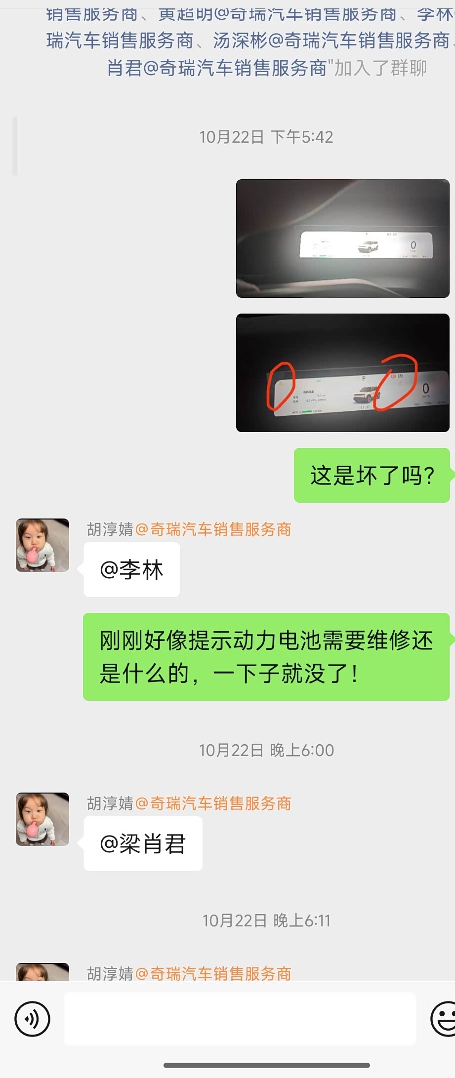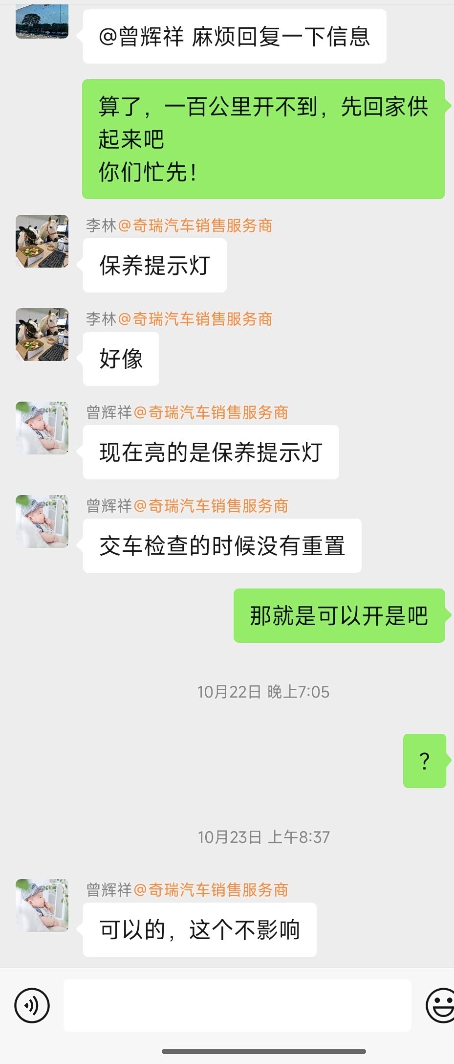 1.上牌后第二天下午,此时行驶了110km。到达高速路口时仪表显示2个故障灯,联系销售,销售让我找售后群,我发故障内容至售后群,无人回复,然后电话联系,无人接听,此时我仍在高速路口等待,2个时间后无人回复,我将车辆移至最近停车场,第二天早上8:37售后回复我“可能交车检查的时候没有重置,关机重新启动一次试下!!!”