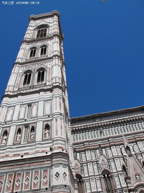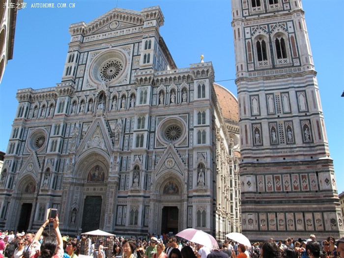 这是一座哥特式的建筑,高106米,其外部以绿、白、红三色大理石装饰,应用建筑学、几何学原理设计修建。杜奥莫大教堂、乔托钟楼和八角形的圣乔瓦尼洗礼堂同在一个大广场上,三座大的建筑构成一体,显得格外雄伟壮观。