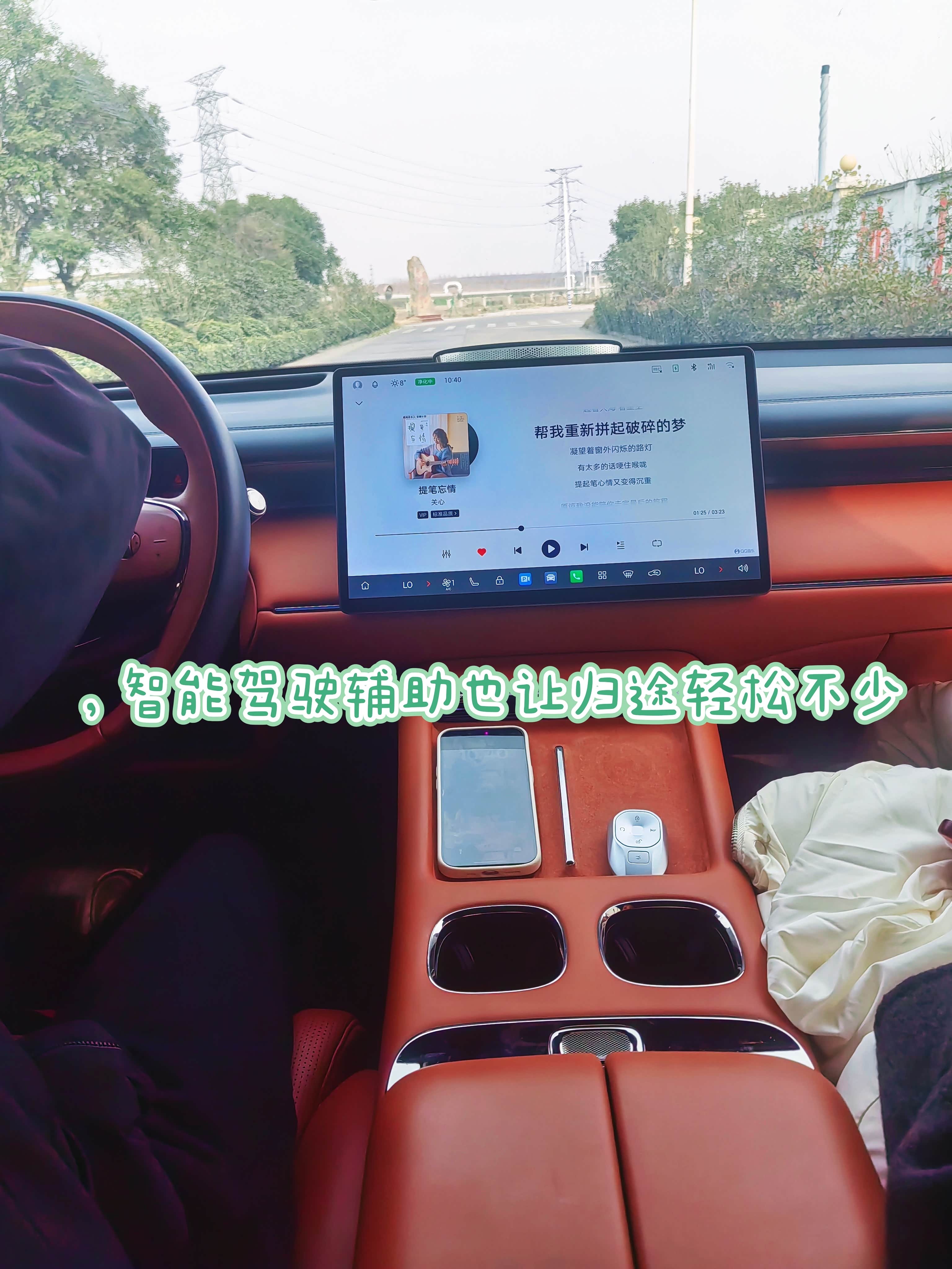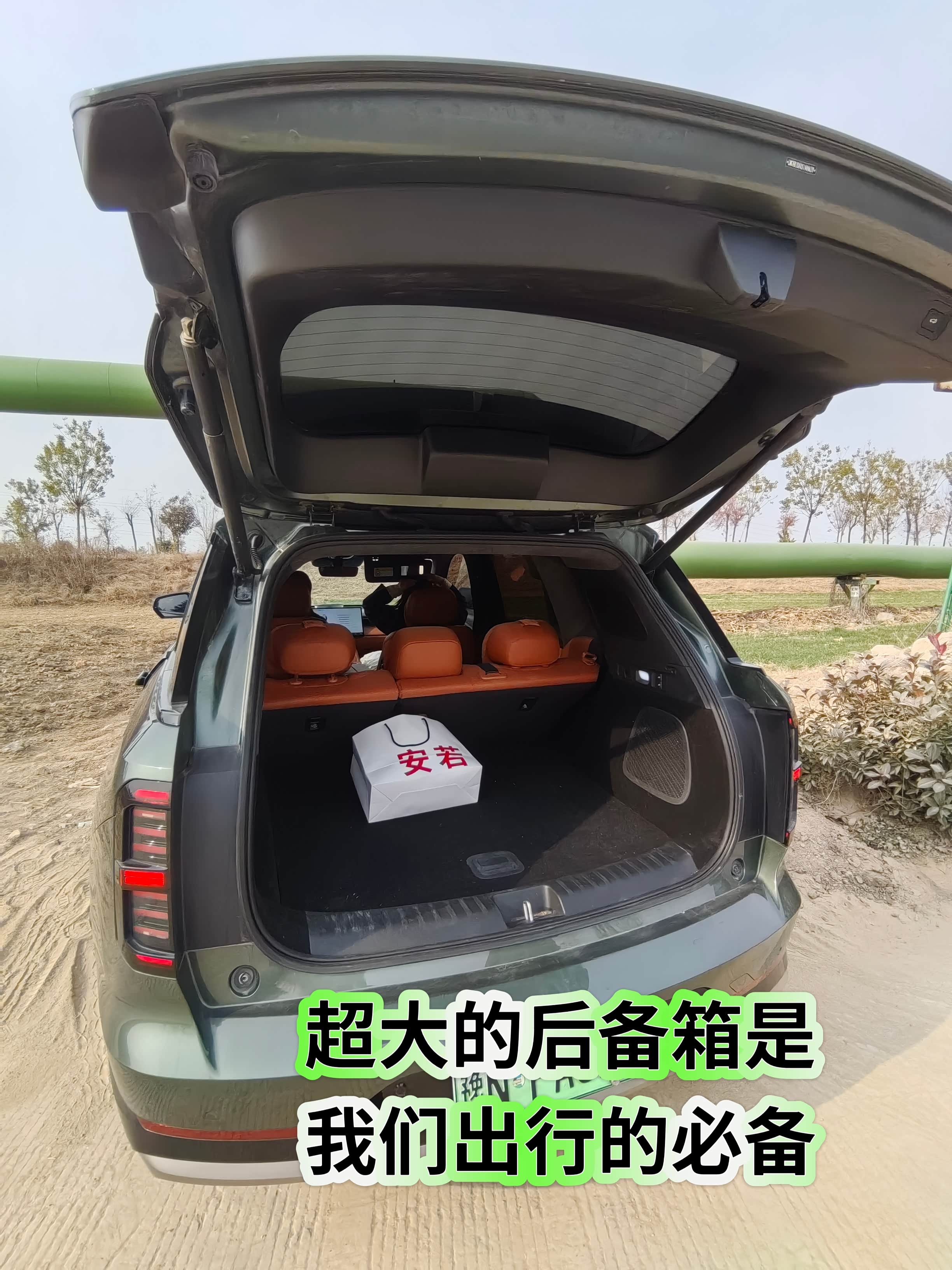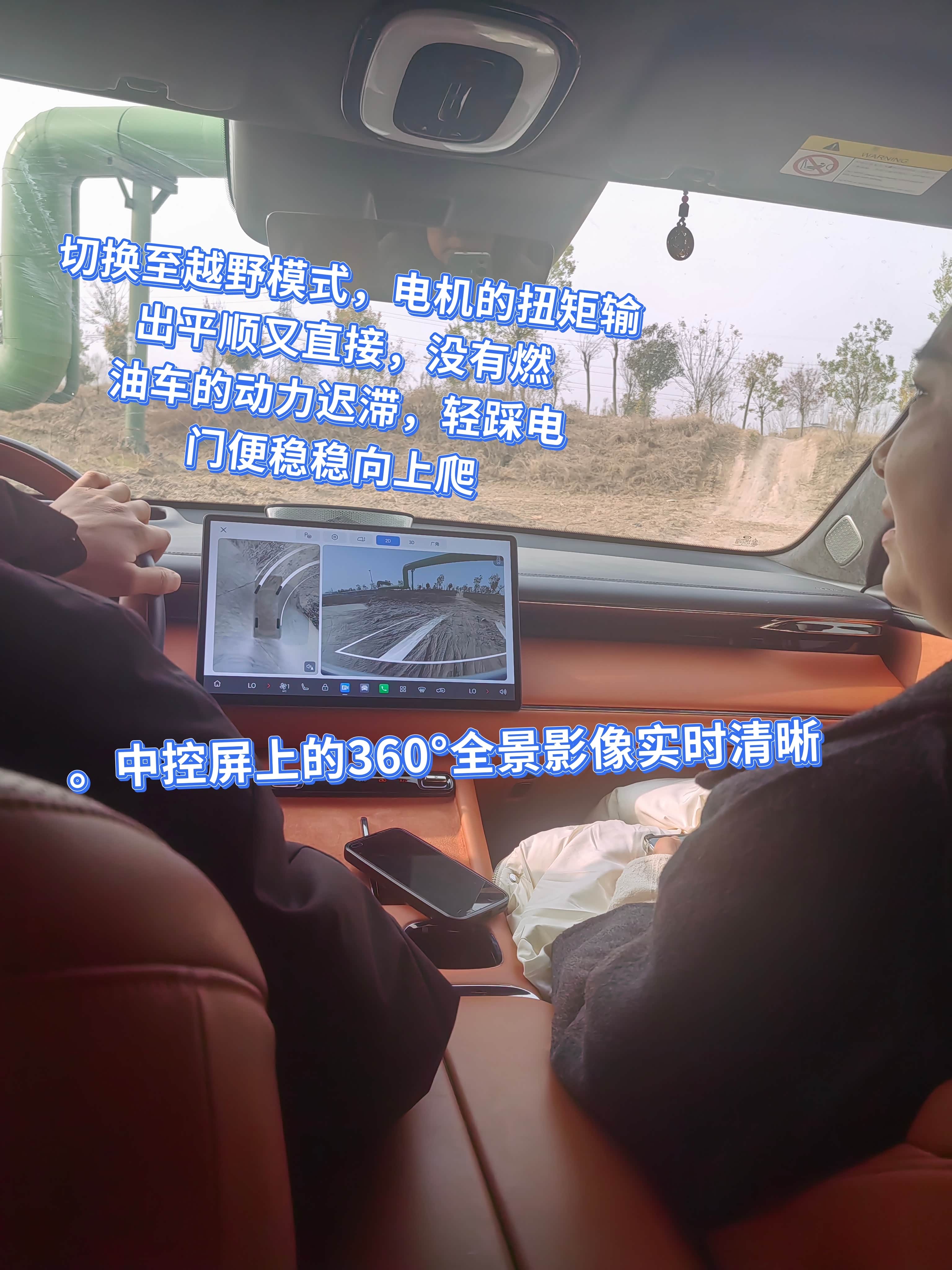 开到一段坡度不小的土坡前,我切换至越野模式,电机的扭矩输出平顺又直接,没有燃油车的动力迟滞,轻踩电门便稳稳向上爬,全程没有打滑的迹象。停在坡顶时,后排的朋友还在吸顶屏上看着视频,丝毫没被路况影响,棕调的内饰在野外的土黄色调里,反倒多了份精致的反差感。
