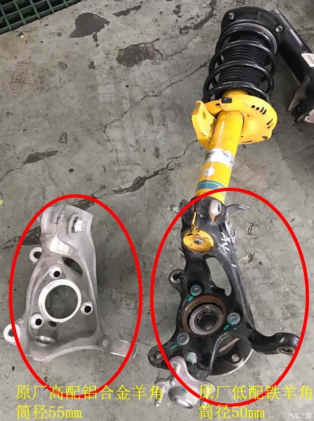 另外在开篇之前先普及下基础知识,以避免走弯路,奥迪A3 1.4版本的羊角和1.8,2.0的羊角筒径是不一样的,1.8,2.0高配实采用的铝合金羊角,羊角的筒径为55mm,而原厂1.4减配成了铁羊角,重量更重不说,筒径也变成了50mm,所以1.4的车友要改避震,得换一对前轮的铝合金羊角、羊角轴承、分泵螺丝,当然不换也可以用类似倍斯登B8筒,但筒径只能用50mm的。铝合金羊角淘宝上大概3-4百左右,由于是MQB平台,A3的铝合金羊角和高尔夫7、凌渡、等车型都是通用的。