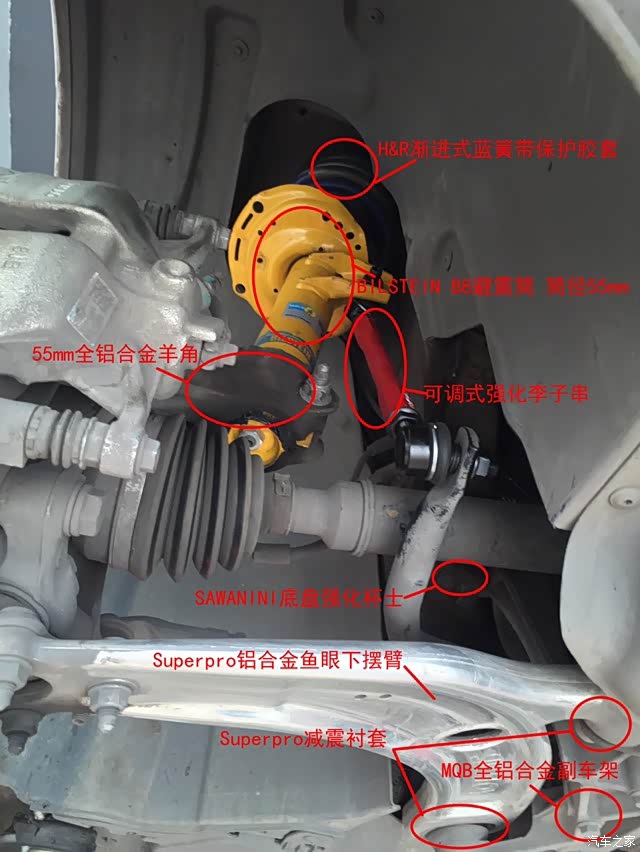 优点:侧倾明显减少,操控提升非常明显,1.4的同学可以不换羊角直接使用50mm的B8避震筒,1.8,2.0的同学也可以直接使用55mm的避震筒。
