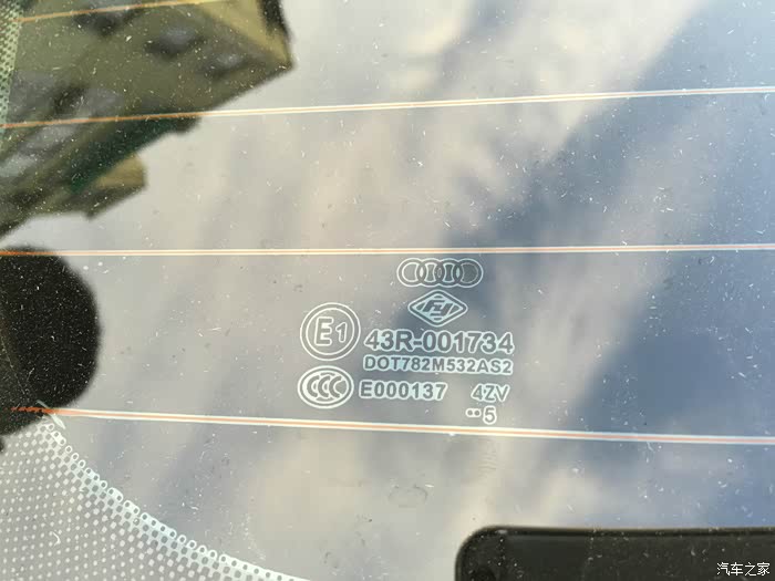 玻璃标识其实很简单的。最上面的奥迪标志大家都看得懂。FY 是福耀玻璃的标志,中国真正的玻璃产业驰名商标,合资车多数都在用福耀的玻璃。E1是欧盟强制认证标志,符合E1的玻璃标准的质量都比较高,右边是厂家代号和编码。3C认证就不必说了,我们国家的强制认证许可。最下面的“··5”代表了玻璃的生产日期,点 在左边说明是上半年生产的,点 在右边说明是下半年生产的。5代表了15年,左边是用 7 - 点数 = 月份,右边是用 13 - 点数 = 月份,例如我的车玻璃就是 15年5月生产的,这点在鉴别二手车是否为事故车方面还是比较有用的信息。