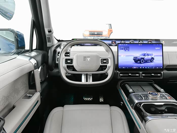 除了强悍的越野能力外,最吸引我的还要属它的内饰部分,打开车门,前档玻璃一块长长的天际屏真的太吸睛,屏幕完全可以代替HUD显示,并且清晰度更高,不用做低头族。左右配备小牛角造型音响,颜值拉满,真的太喜欢了。