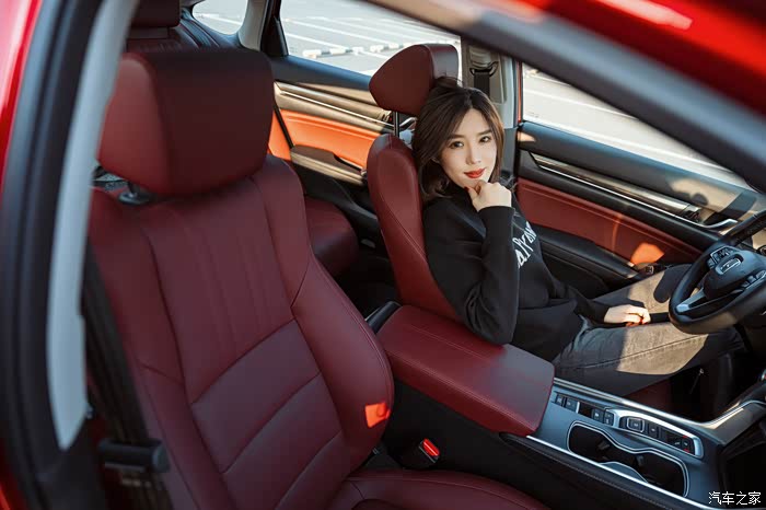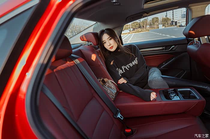 而与外观相呼应的就是内饰的配色了,果不其然,小梦依然选择了红色。突出运动感的同时也让人感觉更有质感,打孔真皮的材质无论是在观感还是触感上都达到了愉悦心情的地步,搭配贯穿杯托,中控台、前后车门以及脚边的一体化车内环绕式氛围灯,小梦形容车内的感觉就用了舒服二字,这里指的不仅仅是前排支持座椅加热和通风功能,还有2830mm的轴距给后排带来了出色的空间表现,坐在后排办公也是她出差时一直会选择的场所,要知道,她的雅阁的后排也同样具备座椅加热功能,舒适配置真的非常全面。