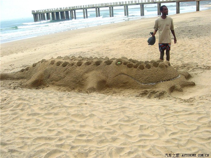这位祖鲁汉子在海边用沙子雕砌成一条大鳄鱼,供游客拍照