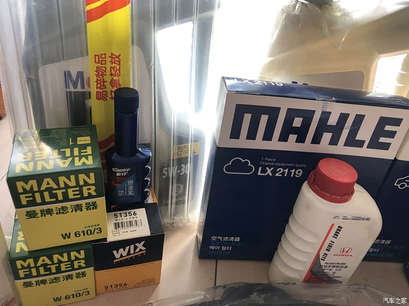东西有 机油5W-30美孚、机油滤清器(1个WIX、2个曼牌610/3)马勒的空调和空气滤清器、 车婆婆买的刹车油和防冻液、刹车片一套、空调的冷媒、雨刷三根(自己换了跟长的短的没换)
