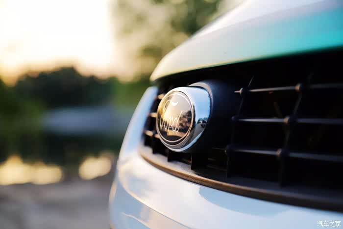 晚霞的光芒照射在凸起的车标,
