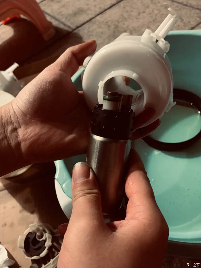 把油泵泵芯从滤芯上抽出来,装在新的汽油滤芯上。注意油泵泵芯上有个绿色密封圈,装的时候要装好,不然会导致泵芯漏气 影响动力。