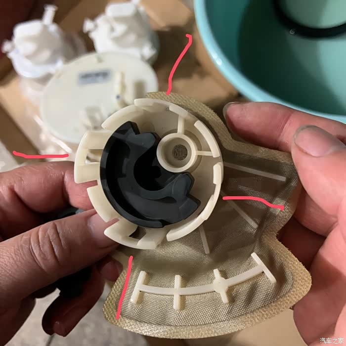 油泵滤芯,有三个卡子固定着。用指甲插进图中红线的位置,小号一字螺丝刀顺着指甲顶住往上抬。一边一个就能撬开。三个卡子都撬开后,汽油滤芯就能拿来下。