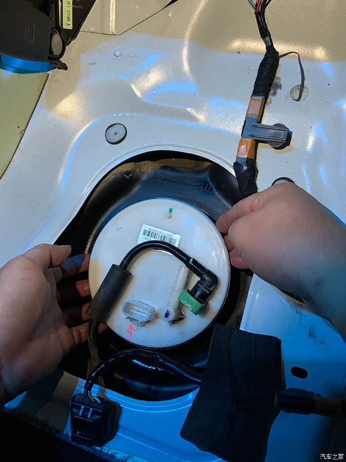 最好是在车没开的时候去换滤芯,这样拆汽油泵油管时,汽油就不会喷出来。我拆了两次,一次车停一天没开拆时汽油只有少量跑出来。 一次刚开回来,拆时 汽油跑了很多出来。 把油箱盖打开,然后拆油泵插头。 用大的一字螺丝刀顶一下我图中红色箭头位置,然后螺丝刀从插头底下翘一下就能拿下来。