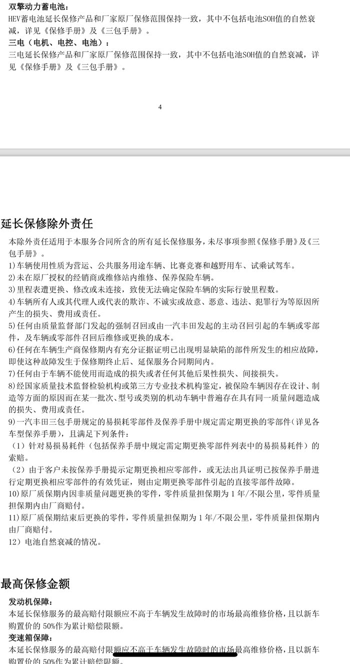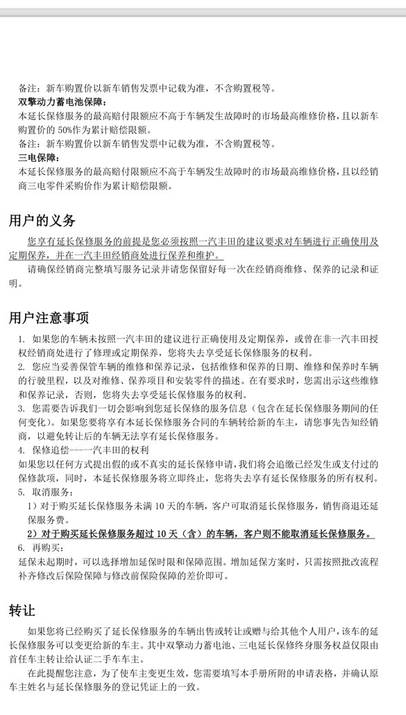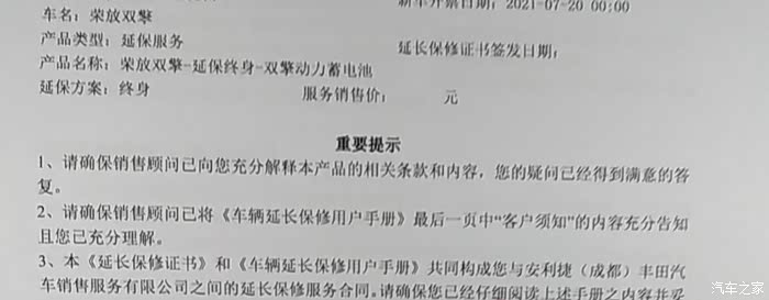 4S说双擎动力电池终身质保有优惠,999元优惠价购买,限制在两年之内四万公里的车。本身车是八年二十万公里的双擎动力电池保修,而且是镍氢电池比较耐用,双擎丰田技术特点也是利于电池寿命,十年八年应该没问题,但是毕竟电池和整体系统还是有出问题的风险,纠结半天,考虑以后电池系统再便宜,现在付出999元也是经济实惠的保障,车子是2021年7月20日买的,马上超过2年限制(里程倒是不多只有两万),再过十天也不能买了,于是就下决心买了,智商税不智商税也无所谓。