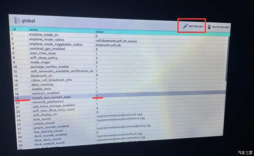 root之后同样用“悟空遥控器”安装“SQLite Editor”,安装完成后打开刚刚安装的“SQLite Editor”,第一次打开会提示获取root权限,点击“允许”,点击“APPS”,往下翻找到并点击“设置存储”,再点击“settings.db”,选择“global”,找到第19行:install_non_market_apps,默认的值是0,也就是禁止,选择这一行,再点击右上角的“EDIT RECORD”,把“0”改成“1”即可。这样就可以对车机软件直接检查更新,不再需要手机悟空遥控器推送软件。