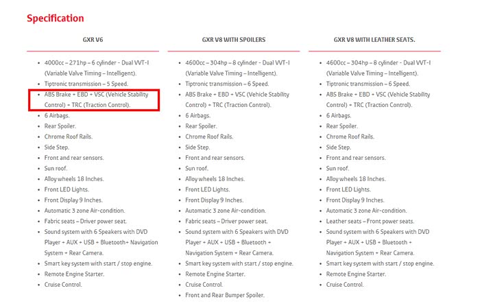 ABS Brake + EBD + VSC (Vehicle Stability Control) + TRC (Traction Control).