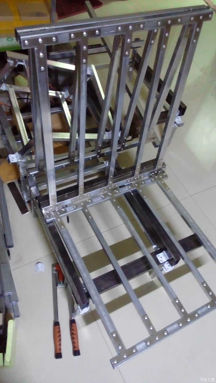 为了和原车座椅重量匹配,都是钢管结构,全车铆接,没有一个焊点。。。在家里做结构和功能测试。。。按照车里的实际尺寸做安装前测试。。。继续测试。。。双单人...
