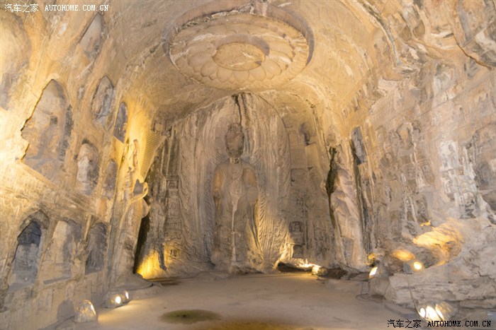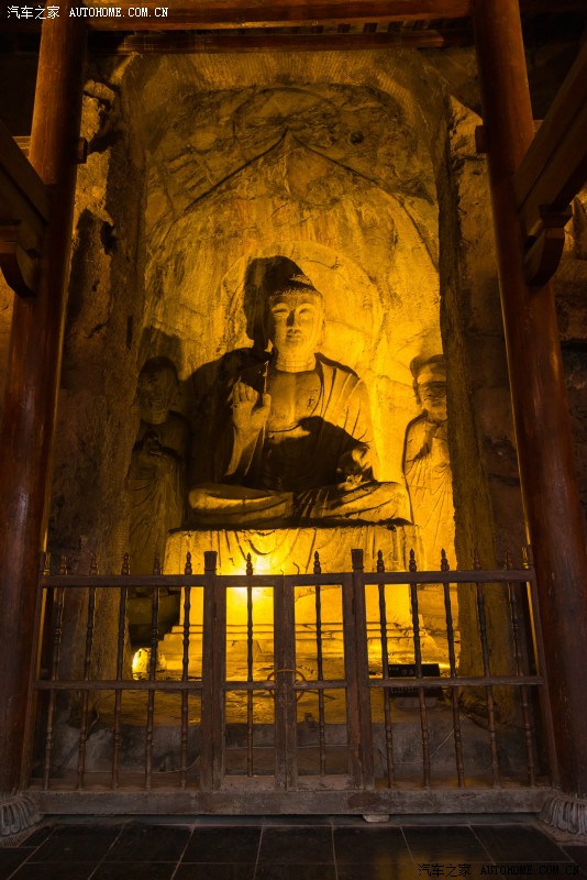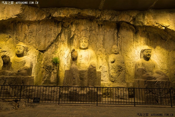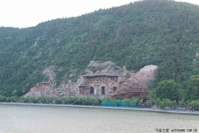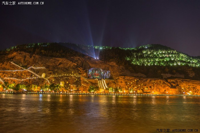 原计划第二天游览龙门石窟的,但咨询了前说现在有夜游石窟比白天漂亮,我们当即决定马上出发夜游龙门石窟,确实另有一番风味。 龙门石窟是中国四大石窟之一 ,位于洛阳市城南6公里的伊阙峡谷,这里香山和龙门山两山对峙,伊河水从中穿流而过,古称“伊阙 ”。唐代大诗人白居易曾说:“洛都四郊,山水之胜,龙门首焉”,此处素为文人墨客观游胜地;又因石质优良,宜于雕刻,故而古人择此而建石窟。这里青山绿水、万象生辉,伊河两岸东西山崖壁上的窟龛星罗棋布、密如蜂房。