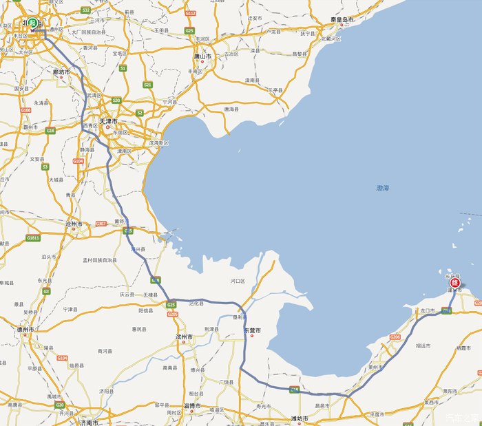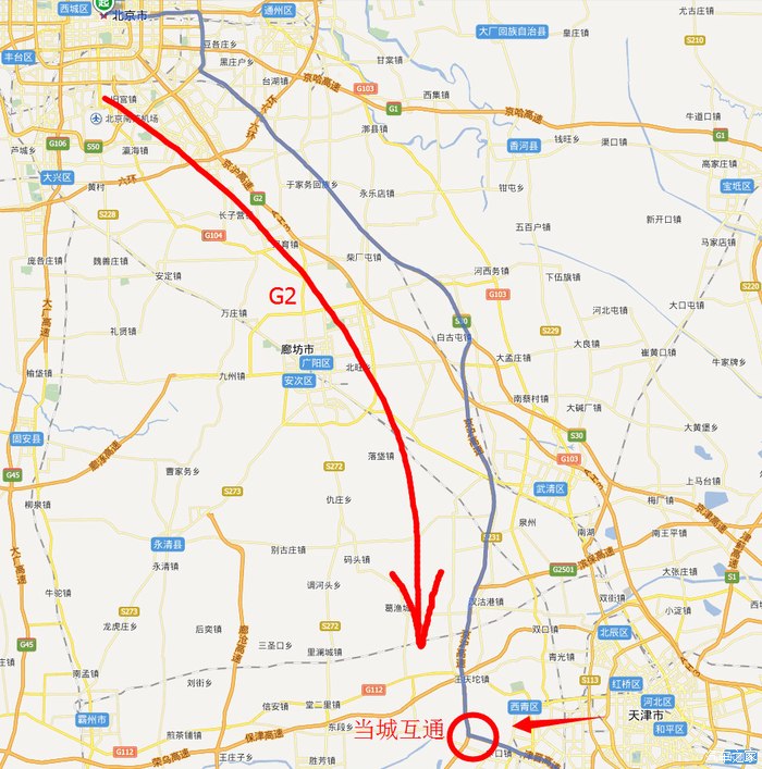 北京市出发走京沪高速(图有误),一路向南开到天津正西侧的当城互通。(110公里)