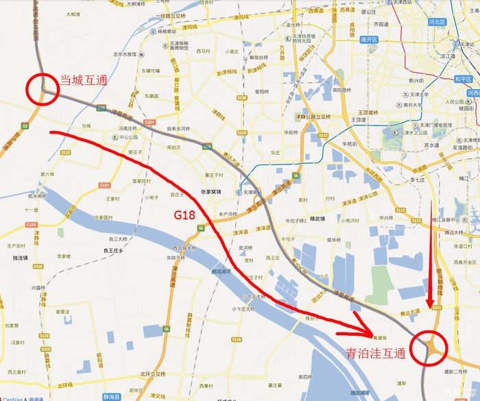 在当城互通岔口向东走津晋高速,一路向西南方向到天津正南侧青泊洼互通(30公里)