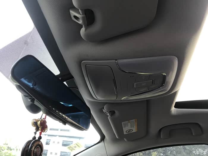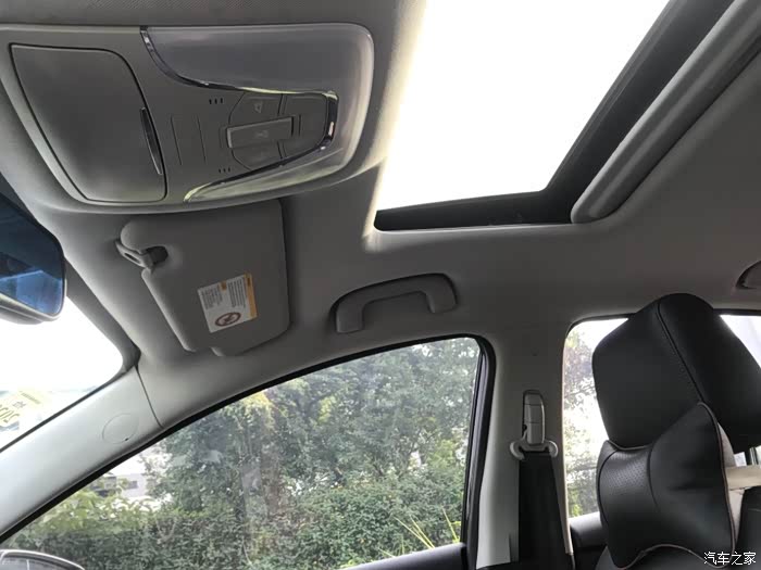 顶部做工精细,整个内部都用了布料包裹,车内顶灯开关,电动天窗开启融合一体。
