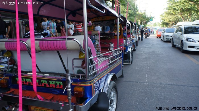 传说中的泰国TUTU车~~~我在曼谷只坐过一次就不敢坐了,太危险了,坐上面在街像上赛场一样,太刺激了。。当晚还跑赢了曼谷的一台白色林宝坚尼。。真的。。TUTU车全是改了直排的。。。基本上是炸街专用车。。。。估计就差没改涡轮了。。。